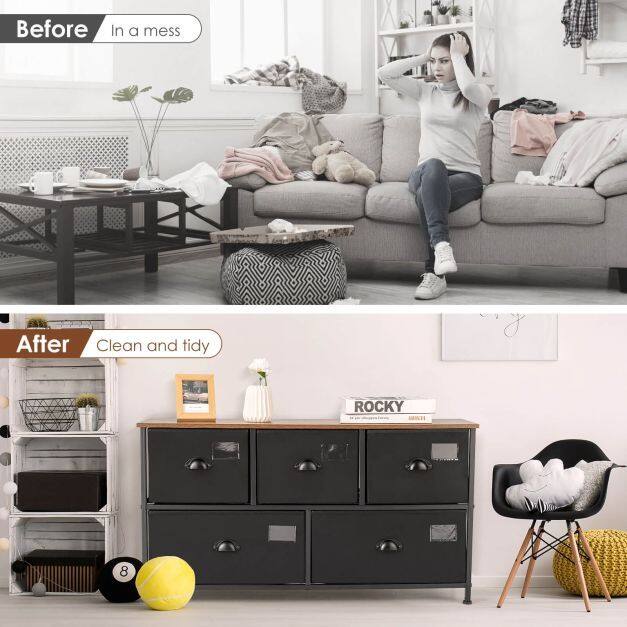 ● 5 Collapsible Drawers: This storage organizer includes 2 large drawers and 3 medium drawers perfectly satisfying your different storage needs. Meanwhile, this dresser tower will help you prevent clutter so as to create a clean and tidy room. It also brings much convenience to store a variety of clothing and items in one place.