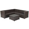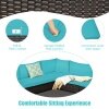 The 6 pieces of patio furniture set include 3 corner sofas, 2 armless sofas, 1 coffee table. Powder-coated steel frame and weather-resistant PE rattan wicker offer durable and sturdy construction for long-term use. The thickened seat and resilient sponge padded cushions provide a comfortable seating experience for you. Each component of this sofa set can be used individually or in combination based on your need. In addition, the tempered glass table is functional use and easy to clean. This rattan furniture set is suitable for your garden, balcony, and poolside. You will find that this rattan set is your ideal choice!
