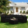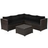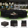 The 6 pieces of patio furniture set include 3 corner sofas, 2 armless sofas, 1 coffee table. Powder-coated steel frame and weather-resistant PE rattan wicker offer durable and sturdy construction for long-term use. The thickened seat and resilient sponge padded cushions provide comfortable seating experience for you. Each component of this sofa set can be used individually or in combination based on your need. In addition, the tempered glass table is functional use and easy to clean. This rattan furniture set is suitable for your garden, balcony and poolside. You will find that this rattan set is your ideal choice!