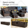 With 1 tempered glass coffee table, 1 storage box, 2 ottomans, 2 armless sofas and 2 corner sofas, this outdoor conversation set comes with various layouts for you to explore. Furthermore, the soft cushions and ergonomic backrests bring comfy sitting experience. After finishing the outdoor gathering, you can transform this patio sectional set into compact size, greatly saving your space. Moreover, the waterproof cover, all-weather PE rattan, anti-rust steel frame and non-slip foot pads endow the characteristics of durability and stability for outdoor use.