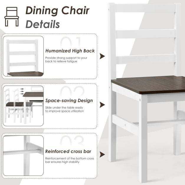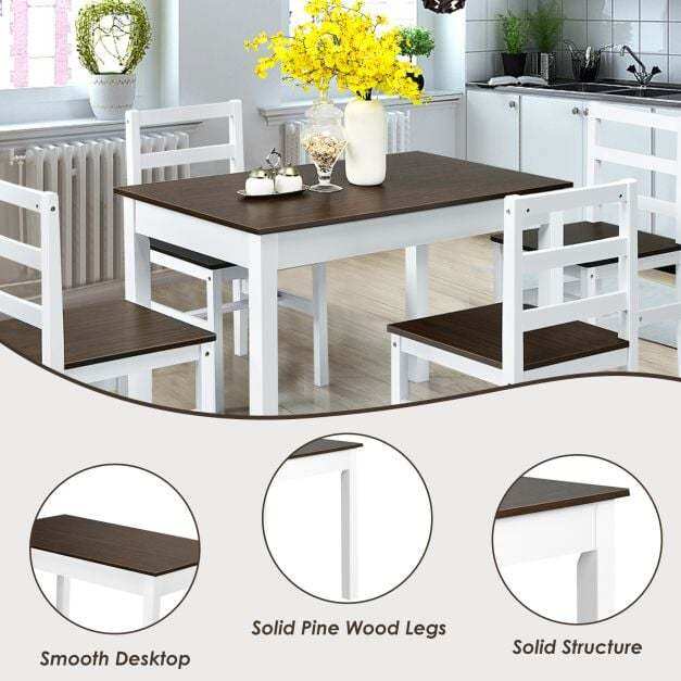 The 100% pine wood table legs and chair legs will provide 110 lbs of table support and 220 lbs of per chair support. Meanwhile, each chair is designed with crossbars to maximize stability.
