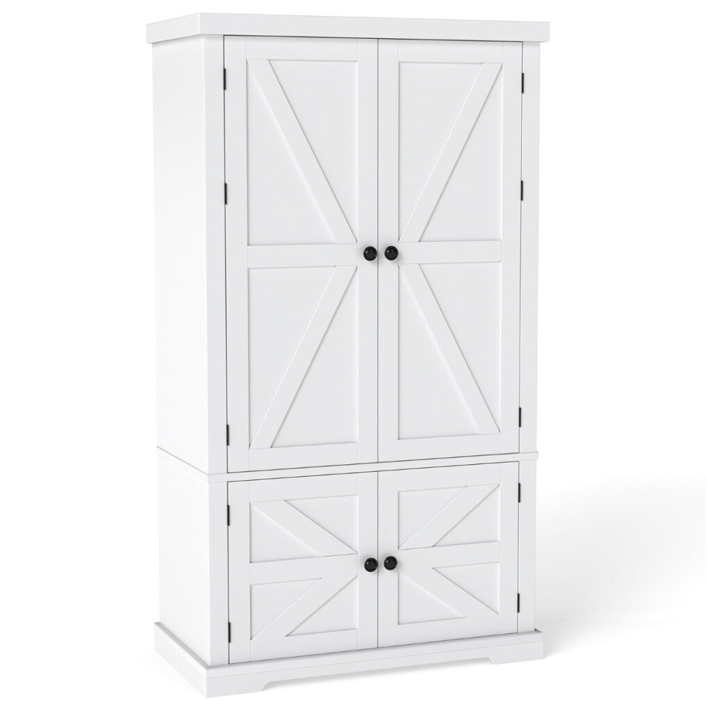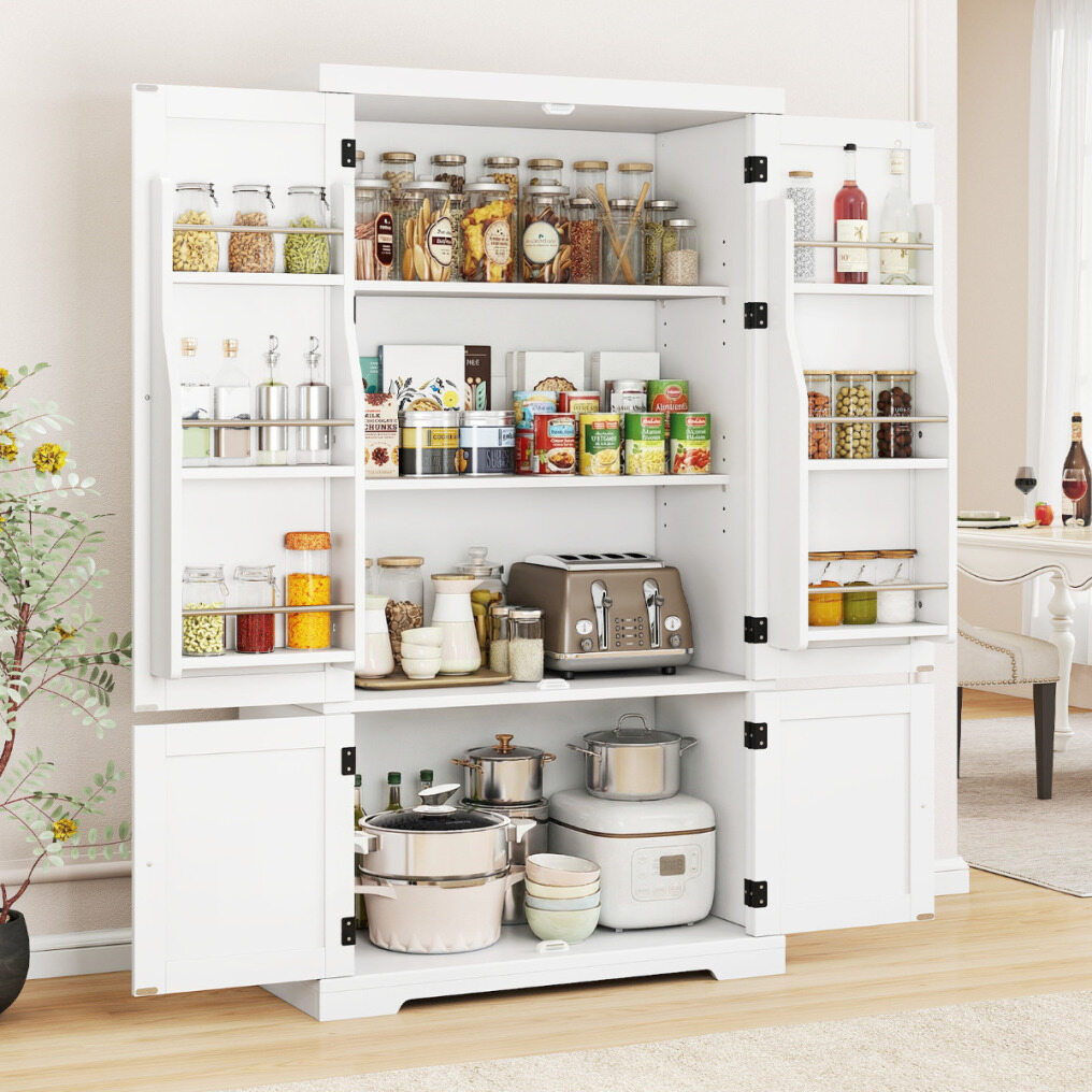 Ample storage space: The pantry features an upper cabinet with two doors and six spacious door shelves, allowing you to neatly organize smaller kitchen utensils. The lower cabinet provides secure storage behind doors for larger items, keeping them out of sight.
