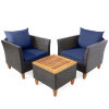 The sofa set is crafted with steel and wrapped with premium wicker, which ensures the sturdiness and durability of set. And the feet are made of solid wood which add sturdiness of the set. They also can be adjusted to apply for uneven ground. Plus, the sofas are equipped with back and seat cushion add excellent comfort for you. And the cover of cushion is designed with smooth zipper for removing and cleaning easily. The coffee table is equipped with a thick acacia wood top for placing foods, drinks or decors. This rattan furniture set will go well with various home styles, which is a perfect complement for your house.