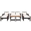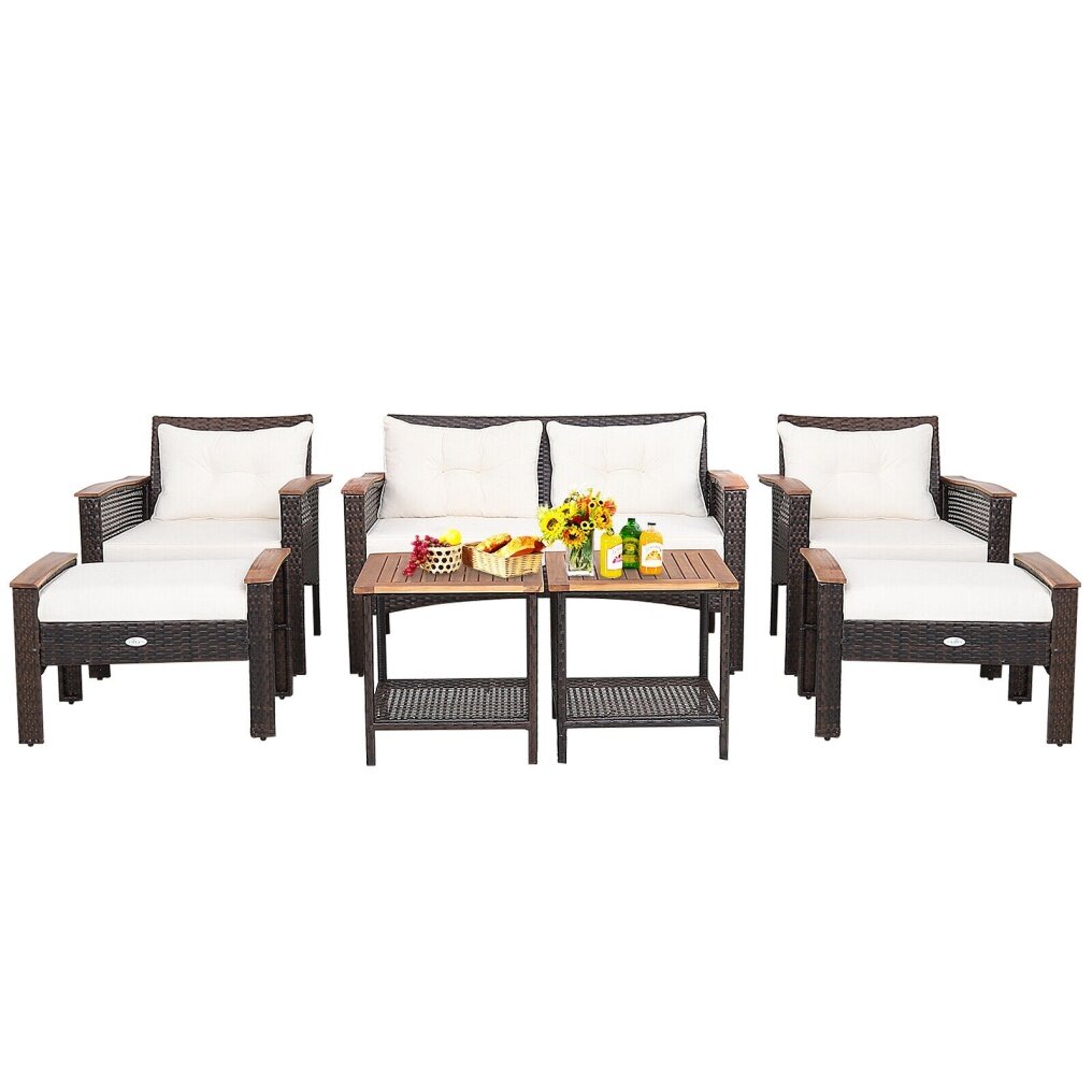 ● Ultimate Comfort: To provide you with a comfy sitting experience, this patio furniture set ergonomically features curved armrests with acacia wood covered and soft cushions with high-density sponge padded. Moreover, the 2 cozy ottomans with cushions offer extra seating and a place to rest your feet.