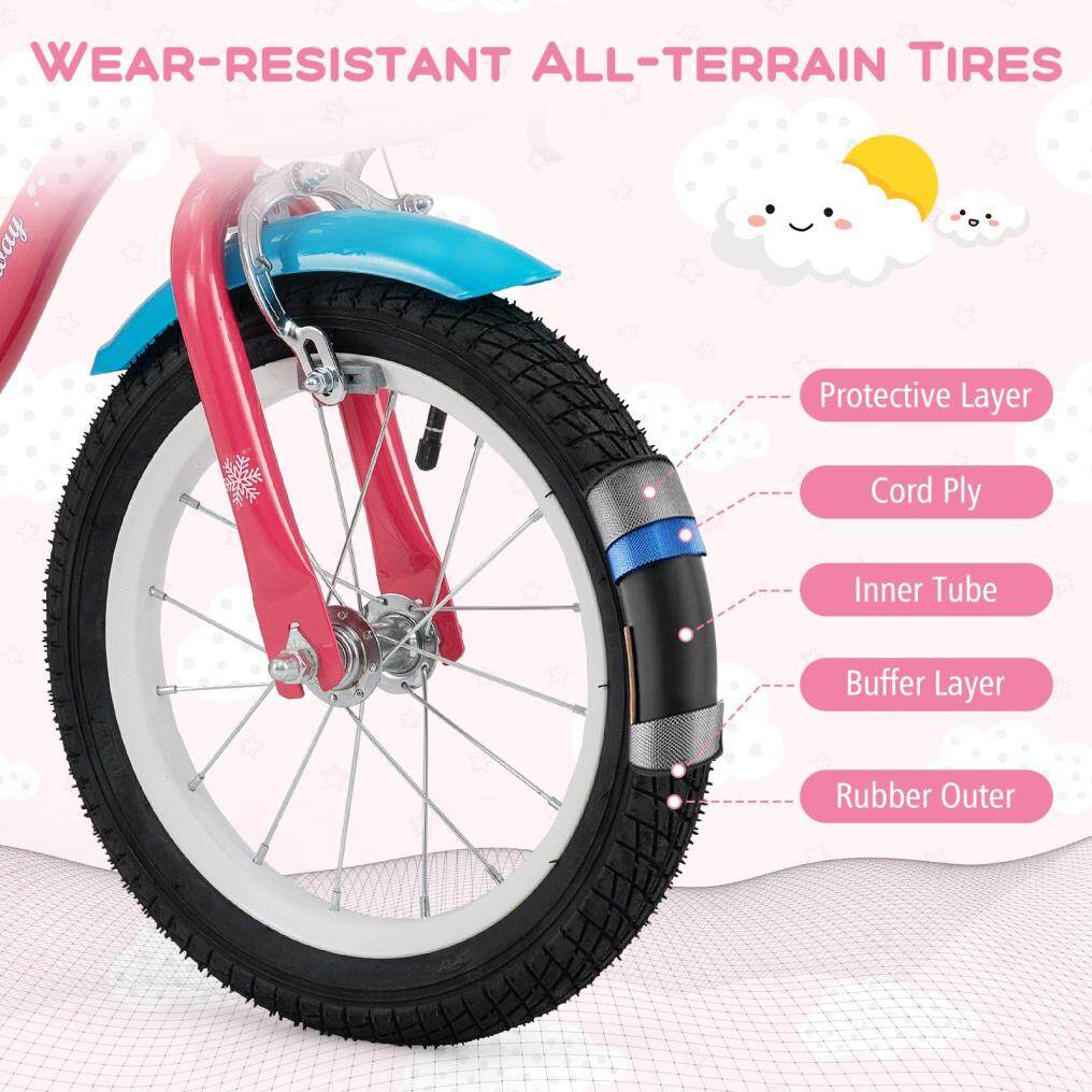 ● All-terrain Tires and Training Wheels: Featuring 2 wear-resistant all-terrain tires, 14-inch bike ensures smooth and steady rides on various roads, such as brick roads, wood floors, cement roads, asphalt roads, and more. Plus, 2 detachable training wheels help your little princess keep balance and learn to pedal independently.