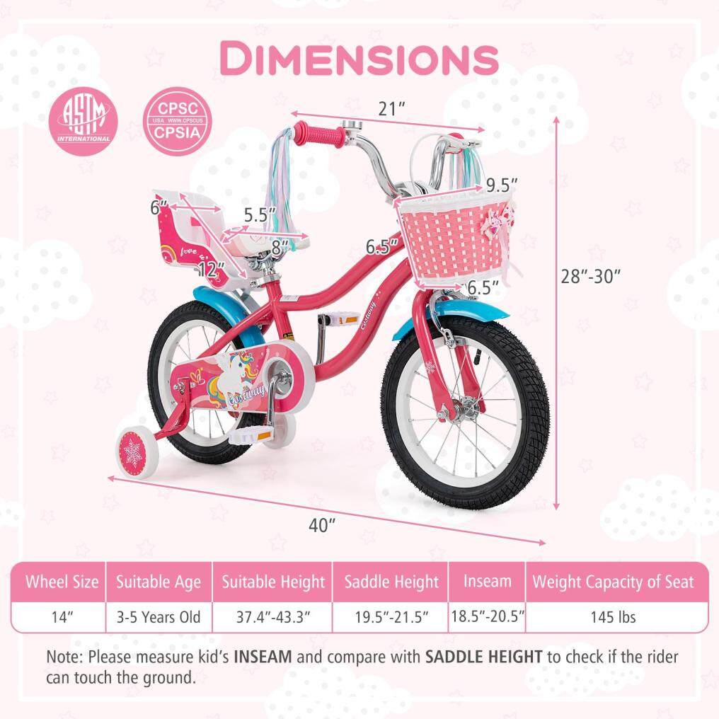 ● 95% Preassembled Bike for Assembly: 95% of the bike body is already assembled. You only need to assemble the handlebar, bell, seat, doll chair, training wheels, and pedals. The bike measures 40" x 21" x 28"-30"(L x W x H).