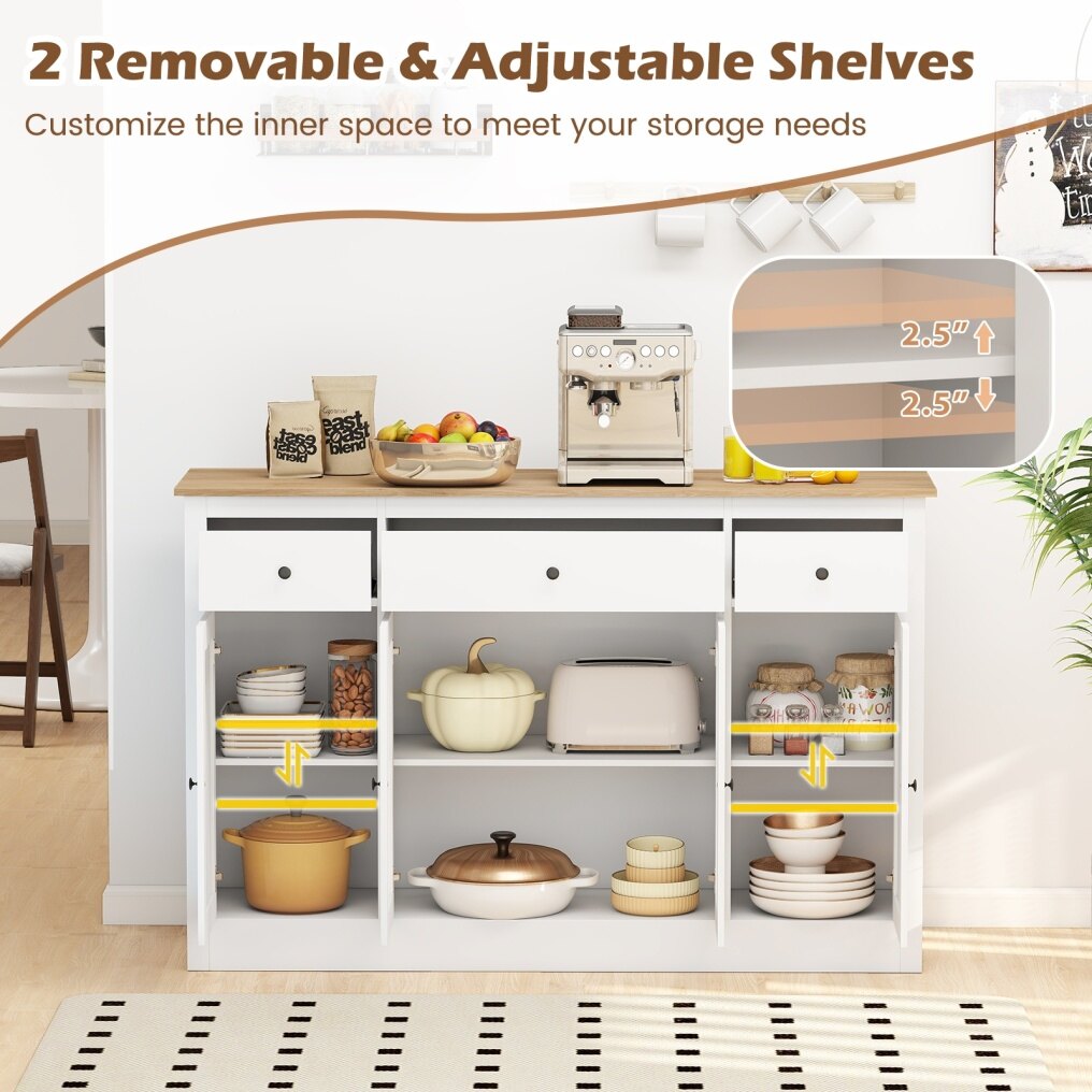 The generous top surface doubles as extra counter space, while 3-level adjustable shelves let you customize storage for anything from canned foods to small appliances. Built with sturdy construction and including anti-tipping kits for added safety, the versatile cabinet transitions effortlessly from dining area to living room as a chic console or bar cabinet. Your clutter-free home starts here with this sideboard buffet cabinet!