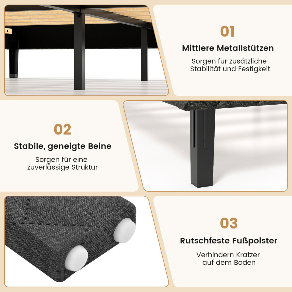 Robust construction: With 10 evenly spaced wooden slats and reinforced metal support legs in the middle, this double/full/queen-size platform bed is stable and durable, with a weight capacity of up to 230 kg/360 kg/360 kg. Sturdy angled legs with non-slip feet enhance stability while protecting your floor.