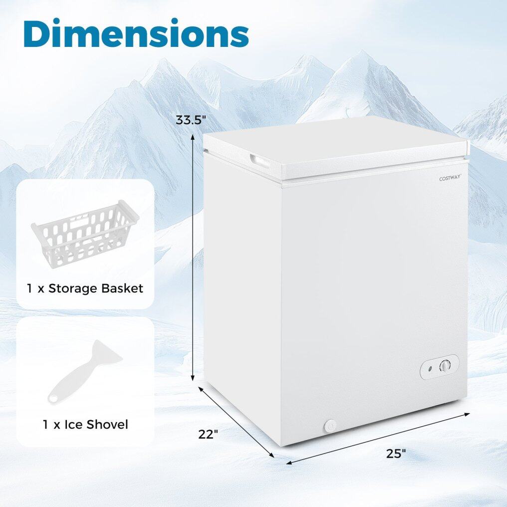 ● 141 L/5 Cu.Ft Large Capacity: This 141 L/5 cube feet deep chest freezer offers sufficient storage space for your frozen goods, such as meat, ice cream, seafood and so on. The included removable storage basket keeps smaller items within reach and makes organization easy.