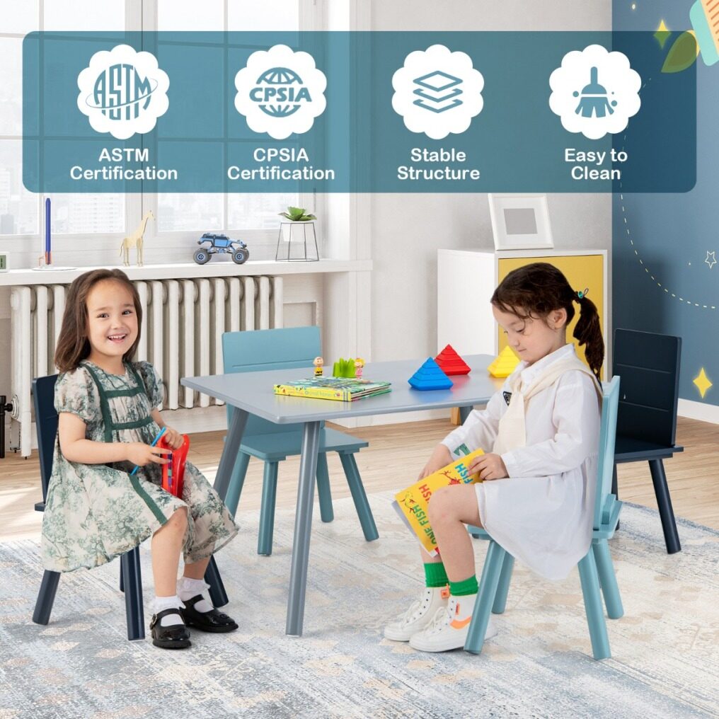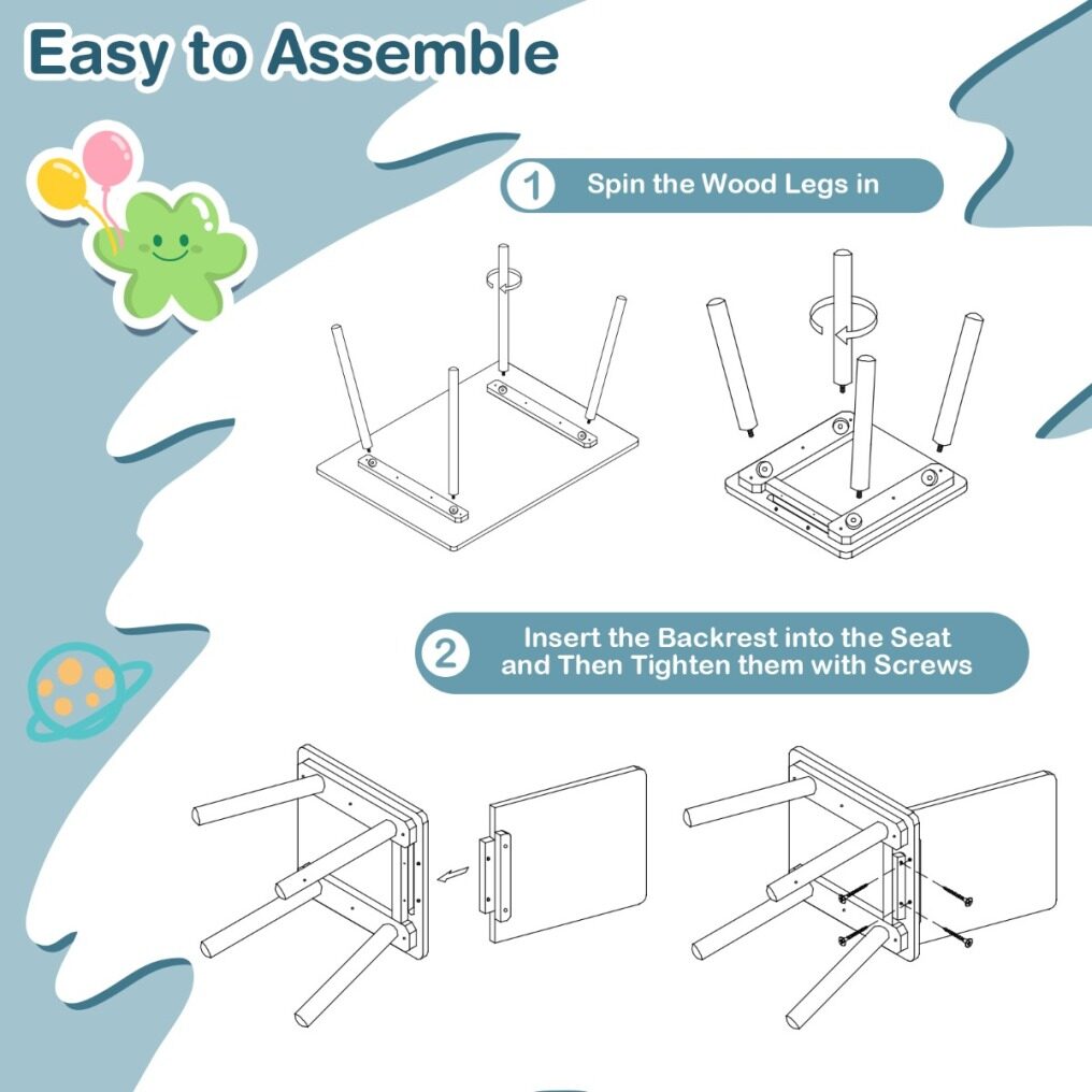 Ergonomic & Stacking Chairs: To cultivate good sitting posture, these wooden chairs are ergonomically designed with backrests, effectively preventing hunchback. If you want this kids furniture to set save your space when not in use, there are 3 ways for you: 1) store 4 chairs under the table, 2) stack 4 chairs on the tabletop, 3) stack the chairs in twos.