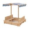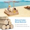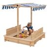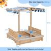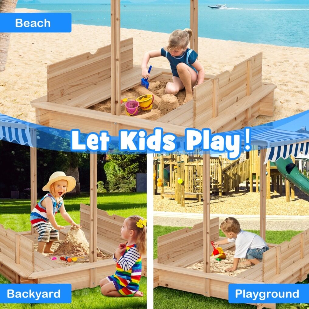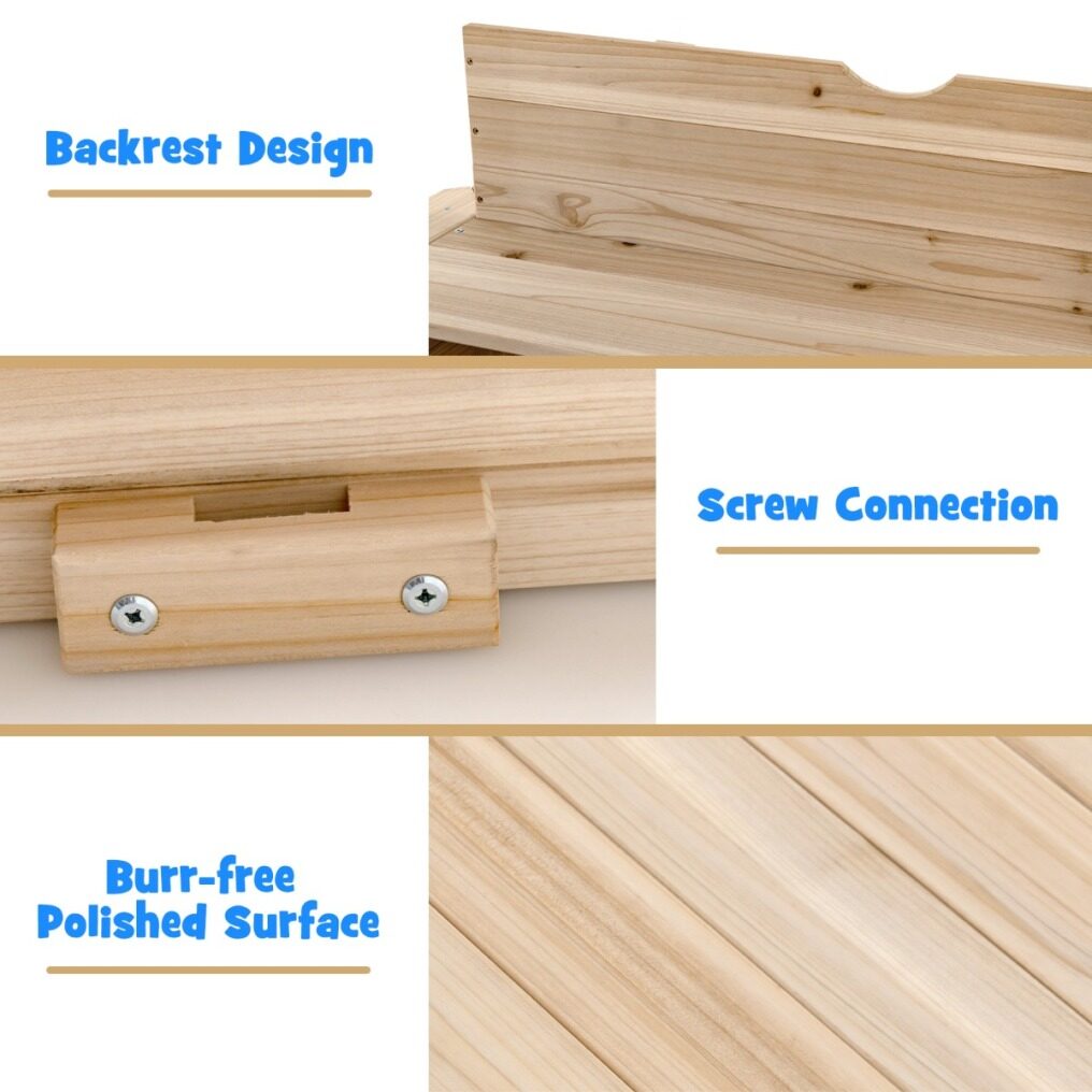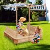 Let your kids play with sand in your kid's wooden sandbox! Our wooden sandpit with bottomless design can keep better ventilation and drainage. The durable canopy can shelter kids from sunlight or drizzle and can be adjustable from 24 cm to 121 cm. And the seat with backrest offers kids a comfortable seating area when they feel tired. Each seat can allow 2 kids to sit. When not in use, you can convert the seat into cover. Besides, the sandbox is made of solid cedar wood for long time use. With this sandpit, kids can have fun in the backyard, beach, playground and more. Tips: the play sand and toys are not included in the package.