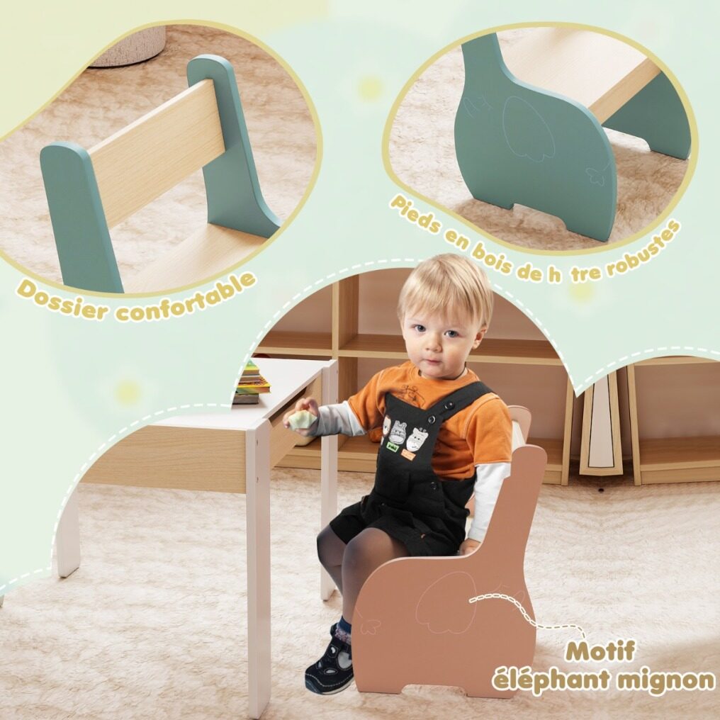 Featuring 2 reversible and removable panels, this activity table can be transformed into a toy table, desk, drawing station, and even a dining table. The large hidden storage space with anti-fall system allows children to learn how to organize and classify toys, thus developing a good tidying habit. The ergonomic chair and comfortable backrest help protect children's spine and cultivate good sitting posture. Whether it's for your little one's birthday or Christmas, this children's furniture set with a beautiful elephant shape is always the best gift choice.