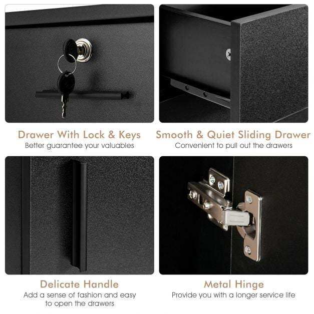 ● 2 Drawers and 1 Large Cabinet: The cabinet top is spacious enough for commonly used tool display. Meanwhile, there are 2 slide drawers with metal handles and the top one comes with a lock and 2 keys preserving your valuables. At the bottom, the closed compartment also offers hidden space for towels and heavy supplies.