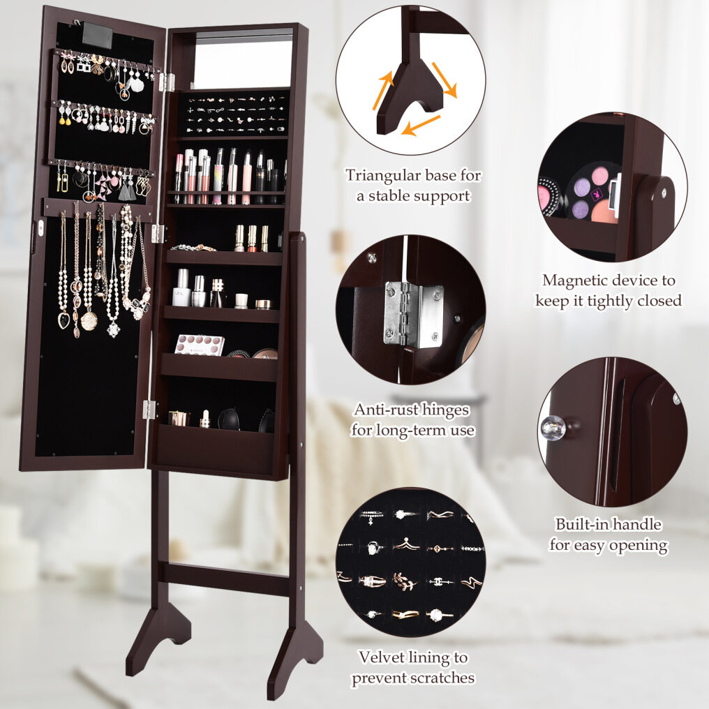 ● Amazing Storage Capacity: 3 lined shelves are designed for holding earrings, 7 hooks are designed for hanging necklace and bracelet, 40 ring slots, 16 lipstick slots, 4 shelves are designed for holding other items. This roomy armoire easily gets all your jewelry neatly organized and maintained in good condition.