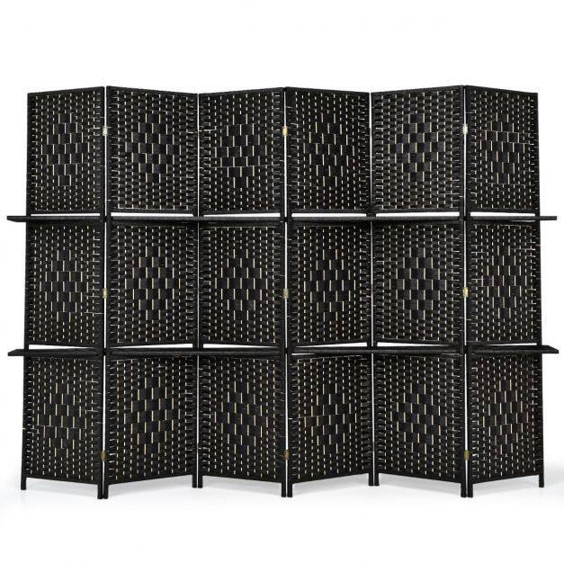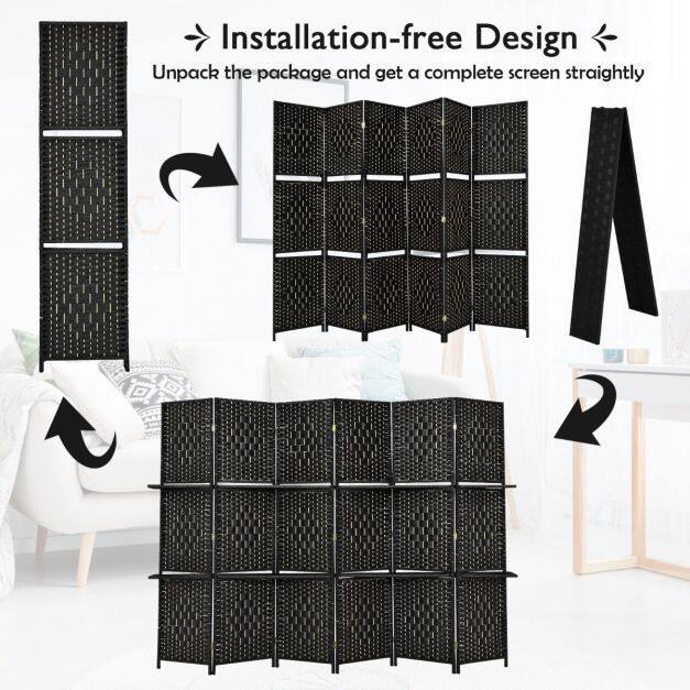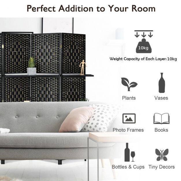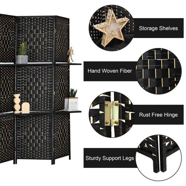 This 6 panel room divider will bring your home natural and elegant sense and can match any styles. With the two shelves equipped, it allows you to place exquisite decors and beautify your room. You can easily separate your room and get your personal space. The hand-woven fiber pattern can take your room to the next level while also features great durability for long-term use. When not in use, you can fold it into a compact size for easy storage and saving space. Definitely, it will be a necessary addition to your home.