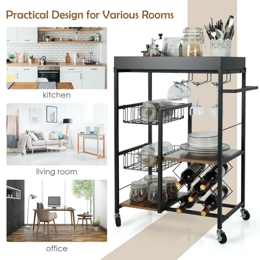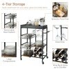 Featuring 2 shelves, 2 mesh baskets, a 5-bottle wine rack, and a glass holder, this 4-tier bar cart offers endless storage options.