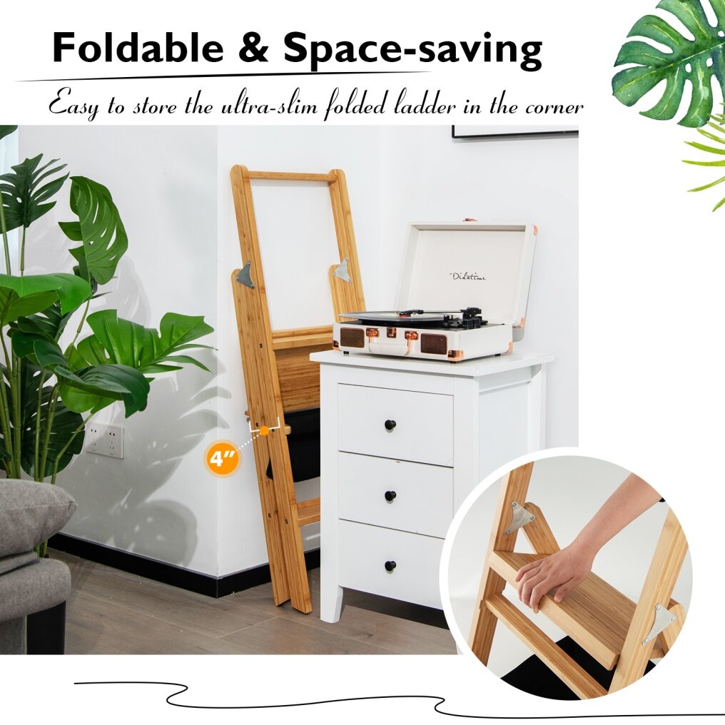● Foldable and Space-saving Design: Featuring a folding design, this 3-step ladder makes movement and storage easier. The lightweight structure allows you to carry it without hassle. Thanks to a folded width of 4 inches, the ladder can be effortlessly stored in the corner or under the sofa to save space.
