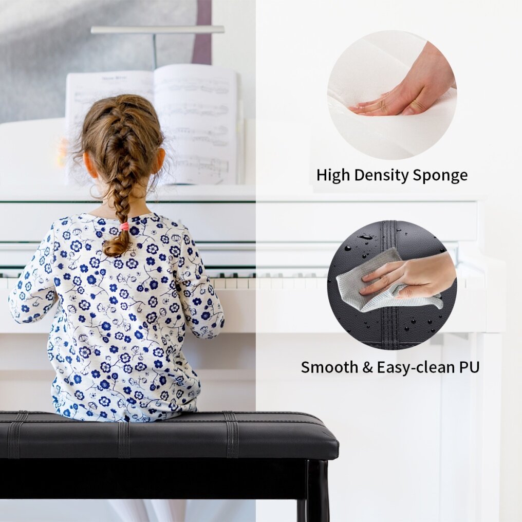 Padded Seat: Padded with high-resilience sponge and covered with soft PU leather, our piano bench makes you feel very comfortable even if practicing for a long time. Covered with PU leather, the piano bench is smooth enough to be kept clean.