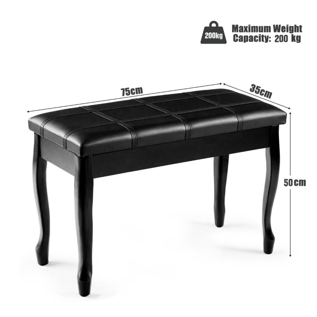 This is our high quality and stylish piano bench which offers a comfortable place for you to practice the piano. Constructed with sturdy solid wood, the piano bench can support two persons safely. Covered with PU leather and padded with high-resilience sponge, you will feel more enjoyable and relaxed. Equipped with a large storage compartment under the seat that provides specious space for holding sheet music and books. What's more, it has anti-slip feet pads under wooden legs, protecting your floor from being scratched. Don't hesitate to buy one!