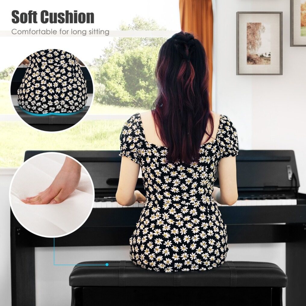 Padded Seat: Padded with high-resilience sponge and covered with soft PU leather, our piano bench makes you feel very comfortable even if practicing for a long time. Covered with PU leather, the piano bench is smooth enough to be kept clean.