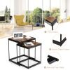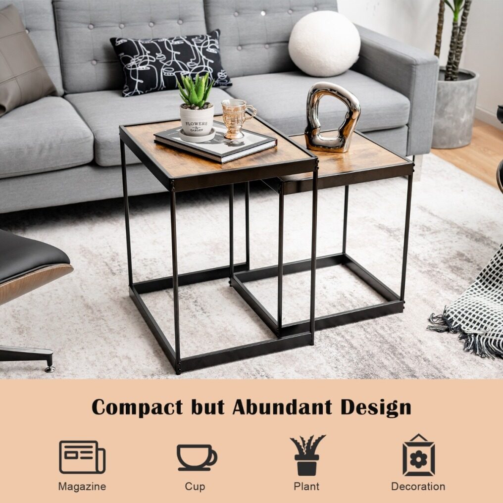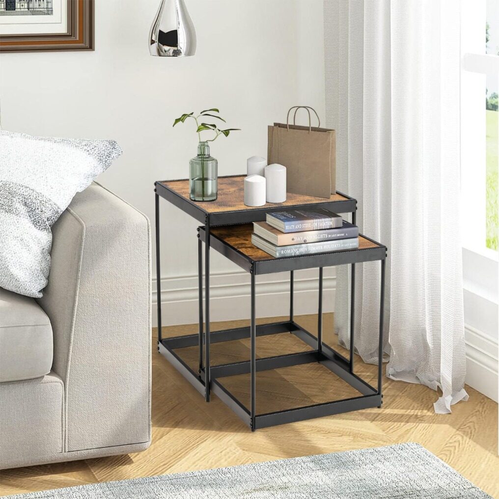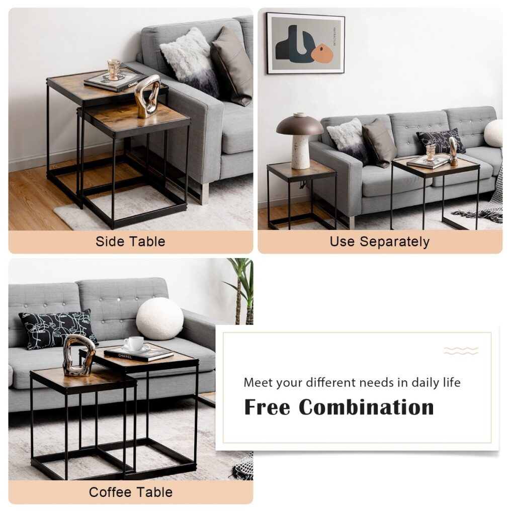 Are you looking for a nesting table with a retro look that can bring a touch of elegance to your living room or office? Our 2pcs square nesting tables is your ideal choice! This set of 2 coffee table can be used separately or together to create enough space for your teacup, magazines and decorations. You can push the small table under the large table for convenient storage when not in use. Constructed by superior MDF board and study steel frame, the side table perform wells in sturdiness and load-bearing for long time use. The non-slip foot pads make it more stable without shaking and protect the floor. Thanks to the waterproof surface, you can clean it with with a damp cloth easily. This elegant table with retro pattern design will be an aesthetically appealing piece of furniture for your space.