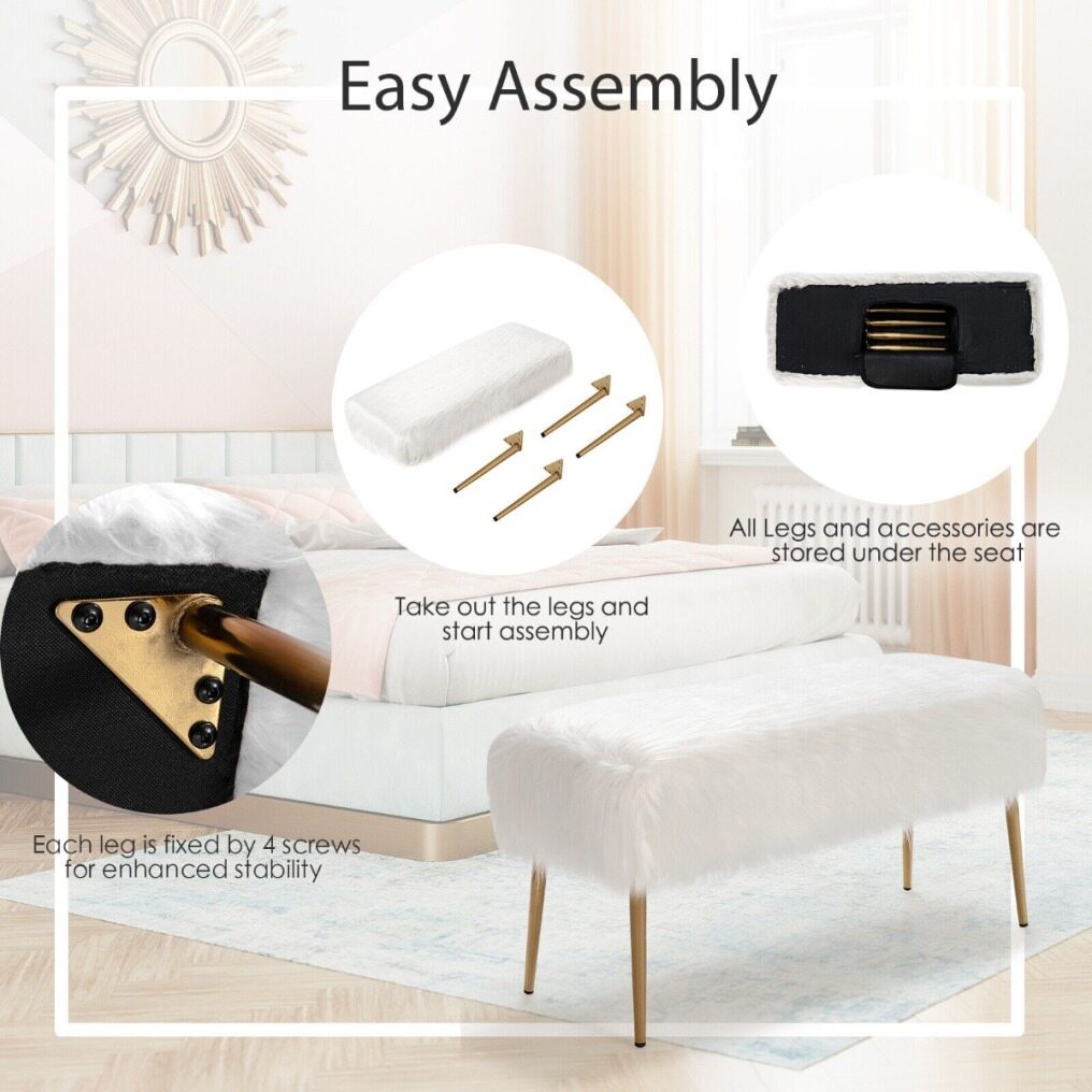 Bring the warm and inviting feeling to your home with this faux fur vanity stool! Featuring plush faux fur and slim golden legs, this vanity chair is quite a sophisticated decoration in your home with actual functionality. The seat base is filled with a high-density sponge to make sure that your buttocks have the uttermost comfort. Each leg is fixed by 4 screws and equipped with anti-scratch pads for enhanced stability. And this vanity chair assembles in 4 steps, which is fast and simple. All legs and accessories are stored under the seat. This vanity chair is widely used for different purposes from living room footstool, bedroom vanity chair to entryway shoe bench. If you are looking for such a product, don't hesitate to place an order!