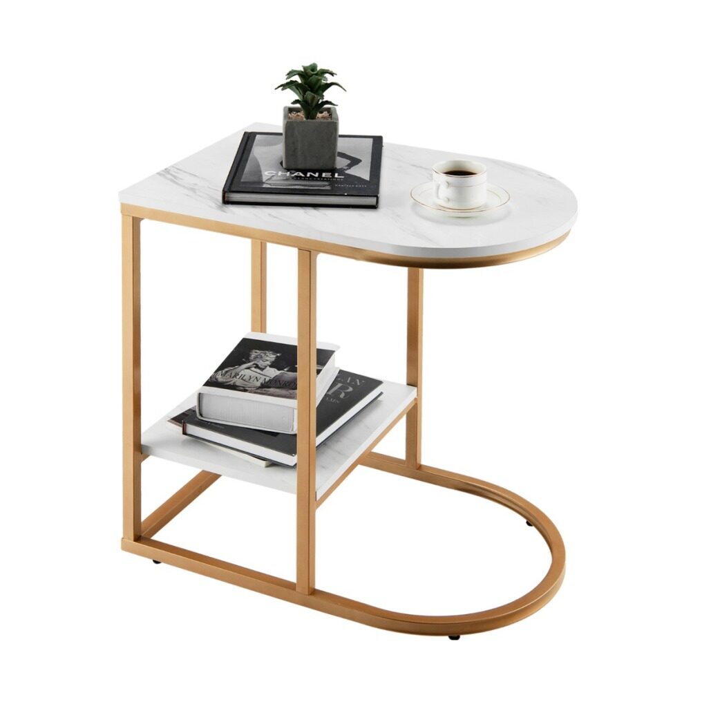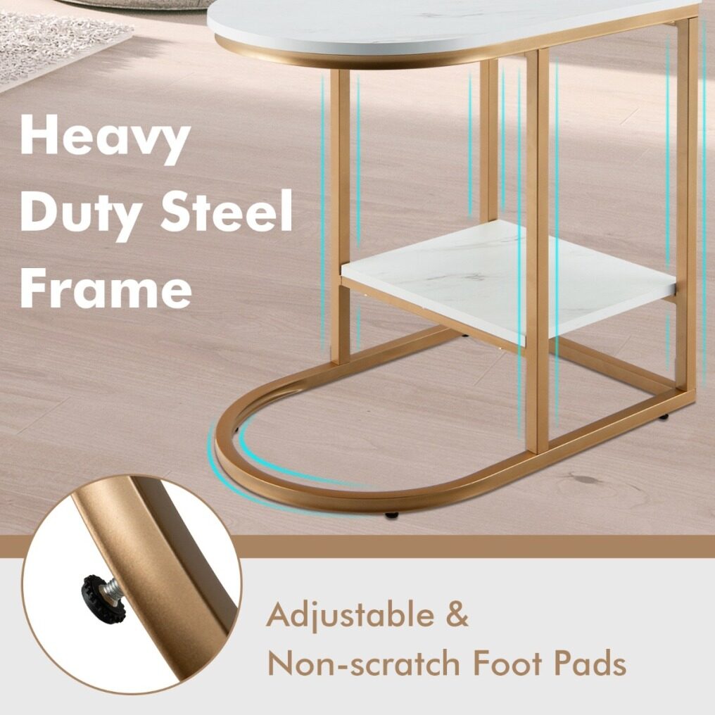 Our C-shaped side table is a functional and stylish addition to your living space! With a specially-shaped frame and flat base, the table easily fits your sofa, armchair or bed to save space while serving its purpose. And the tabletop is spacious enough for laptop, cups and other ornaments. Together with the storage shelf, you can enjoy the leisure time with all necessary items by your side! What’s more, the end table is rather sturdy and durable with heavy-duty steel frame and adjustable non-scratch foot pads. And the marble-like surface and gold finish make the table a real eye-catcher in your bedroom or living room!