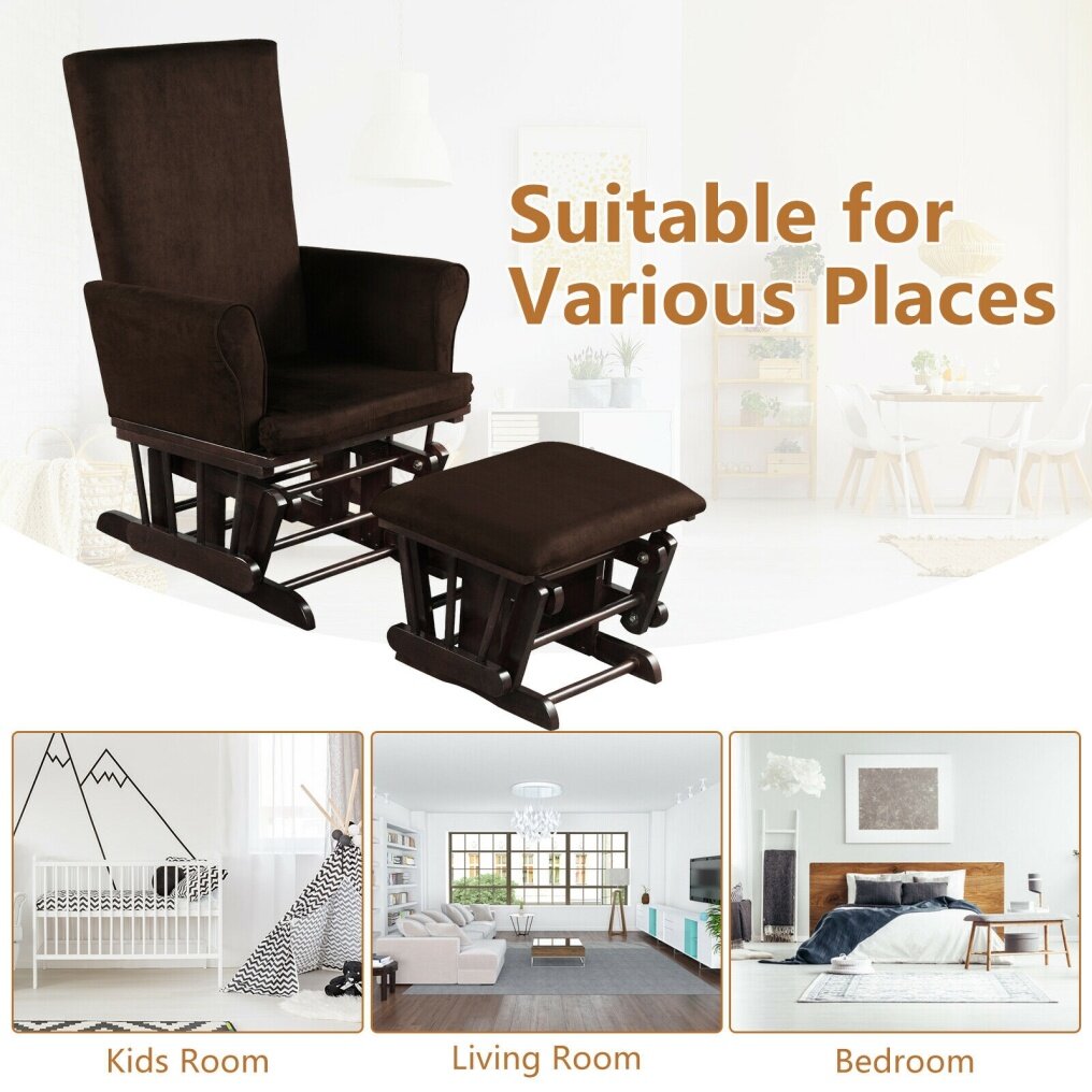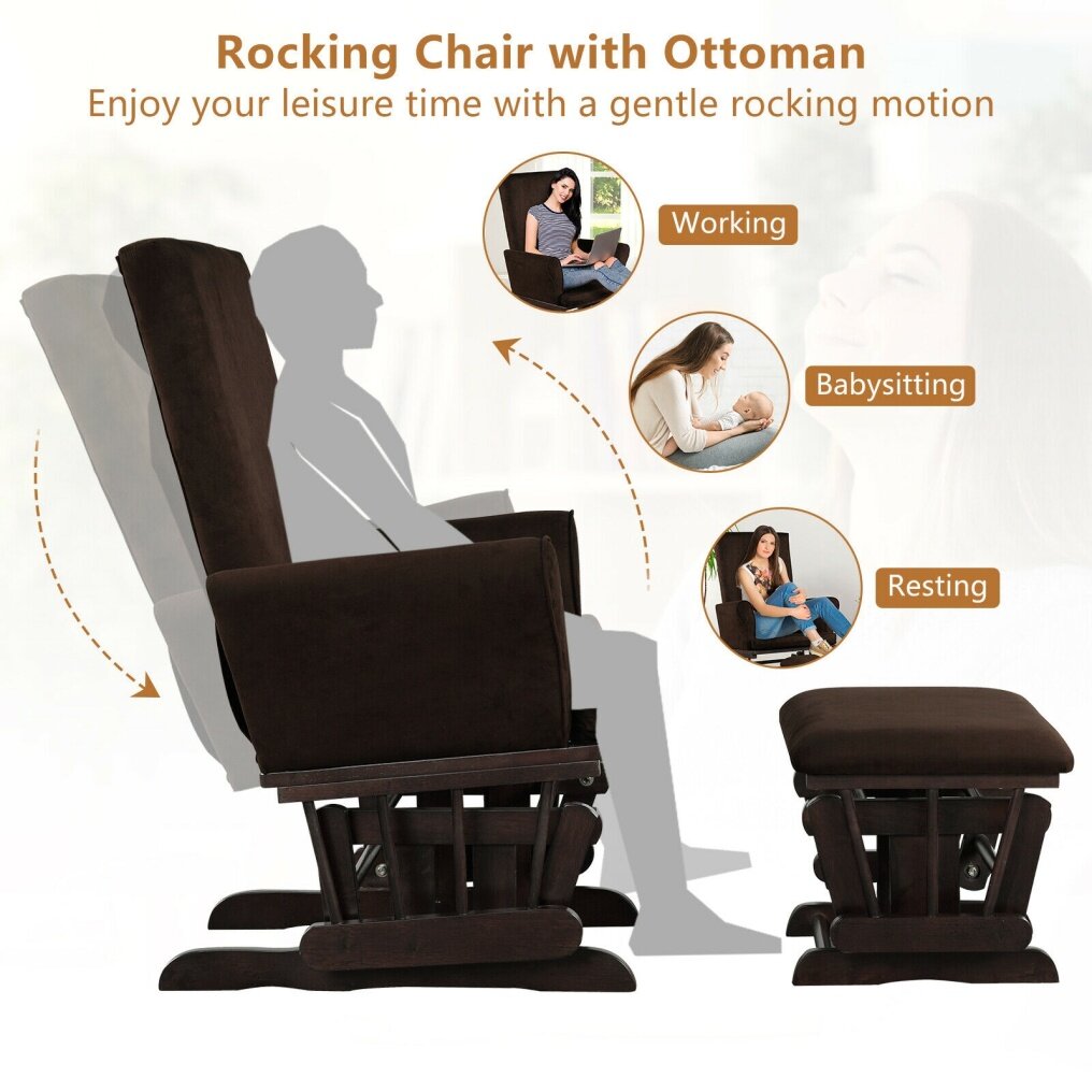 ● Gentle Gliding and Ergonomic Design: With the smooth ball bearings, this rocking chair with ottoman gives you comfortable gliding motion. The padded chair back and armrests can effectively support your spine and arm effectively, and the ottoman provides extra support for your knees, legs, and feet.