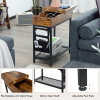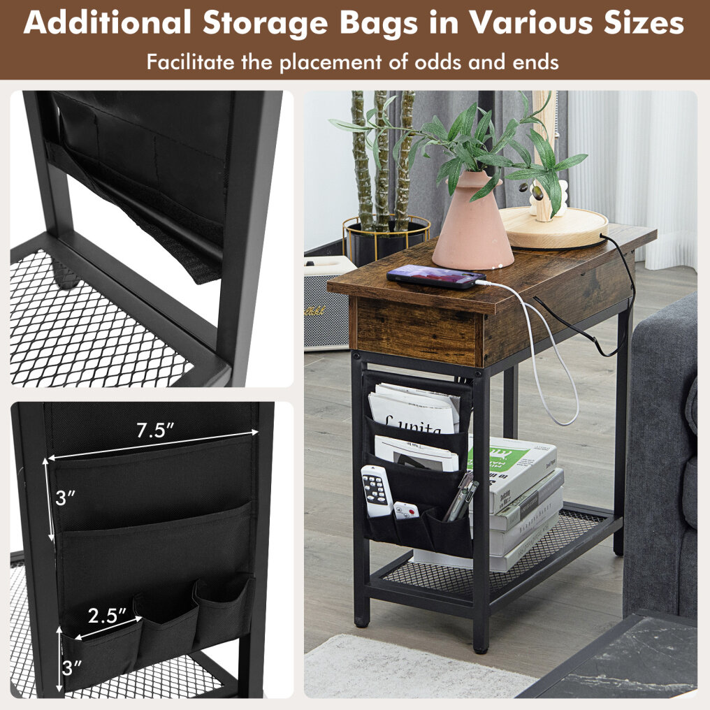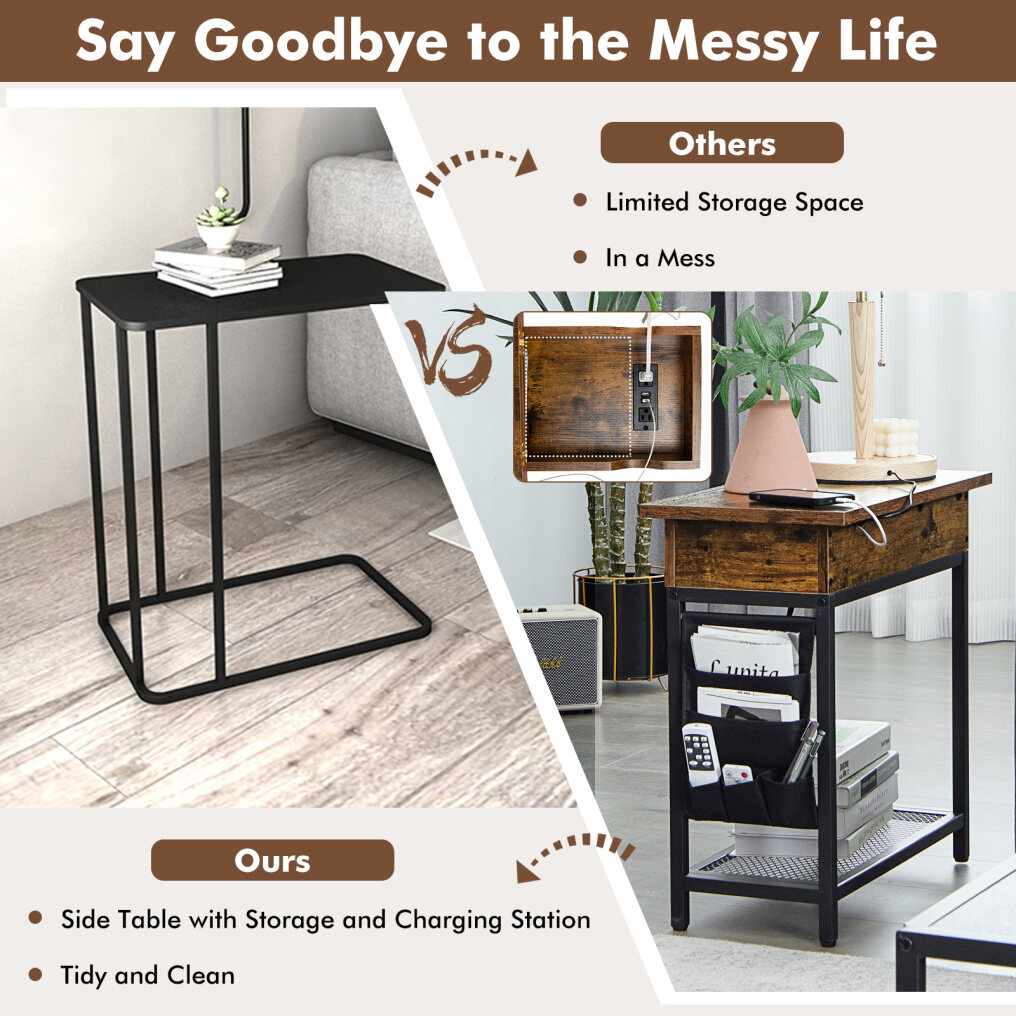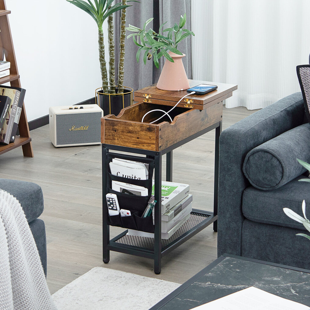 It features an interior power strip that consists of 2 AC outlets and 2 USB ports, allowing you to charge the electronic devices with ease. When the tabletop is closed, the power strip is still available thanks to the 2 side grooves. What's more, the sofa side table can also provide ample storage space, including a side pocket, a concealed compartment and an open shelf, for you to organize the sundries. Besides, the nightstand is also reliable in construction. The heavy-duty steel frame with adjustable foot pads can keep good stability on the carpet or floor. Thus, being functional and stable, the narrow side table is suitable for the bedroom, living room or study.
