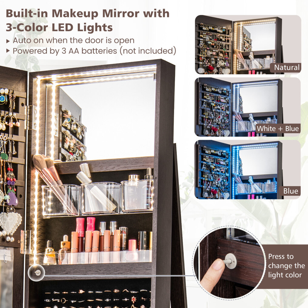 3-Color LED Lights and Foldable Makeup Tray: The LED strip around the internal makeup mirror will automatically turn on when you open the door, and the light can be switched to natural light, blue light and white light to meet your different makeup needs. (The light is powered by 3 AAA batteries, not included). Besides, the foldable makeup tray can be opened at any time to place your eyebrow brushes and lipsticks.