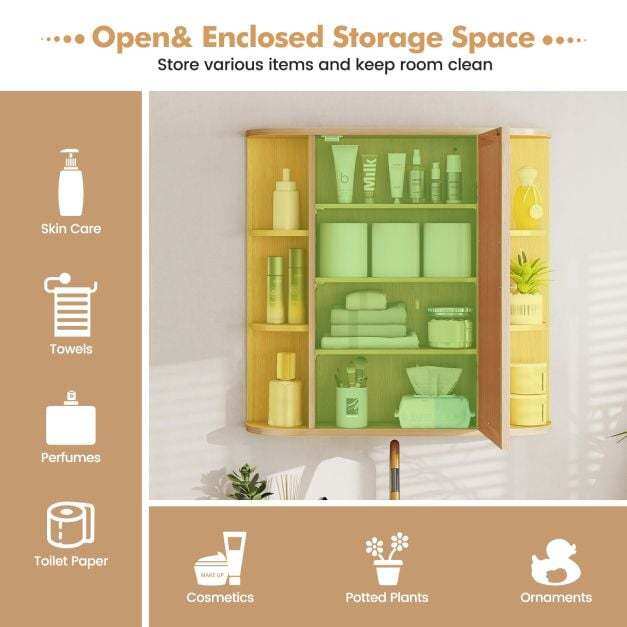 【Convenient Storage and Adjustable Shelves】This storage cabinet features six open shelves for frequently used items such as towels, toiletries, tissues, etc. The mirrored door opens to reveal a shelf that can be positioned at three different heights to accommodate items of varying sizes. Furthermore, the mirror is designed to provide a clear image from all angles.