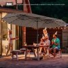 15.4" x 9.2" large canopy provides roomy coverage for a full set of outdoor furniture, and you can spend leisure time with family and friends. The 12-rib steel structure is covered by durable polyester fabric ensures lasting durability for outdoor use. What’s more, each rib has 4 solar LED lights, and there are 48 LED lights that help to enhance the romantic feel at night. And all lights are powered by the top solar panel, effectively saving power. What’s more, there is a standby battery that is prepared for lack of power. It is ultra-easy to open and close the umbrella by rotating the hand-crank mechanism. When the umbrella is not in use, you can close it with a long fixation strap for better storage. More than placing in garden, patio, and backyard, the twin outdoor umbrella is also ideal for commercial places, such as markets, cafes, bars.
