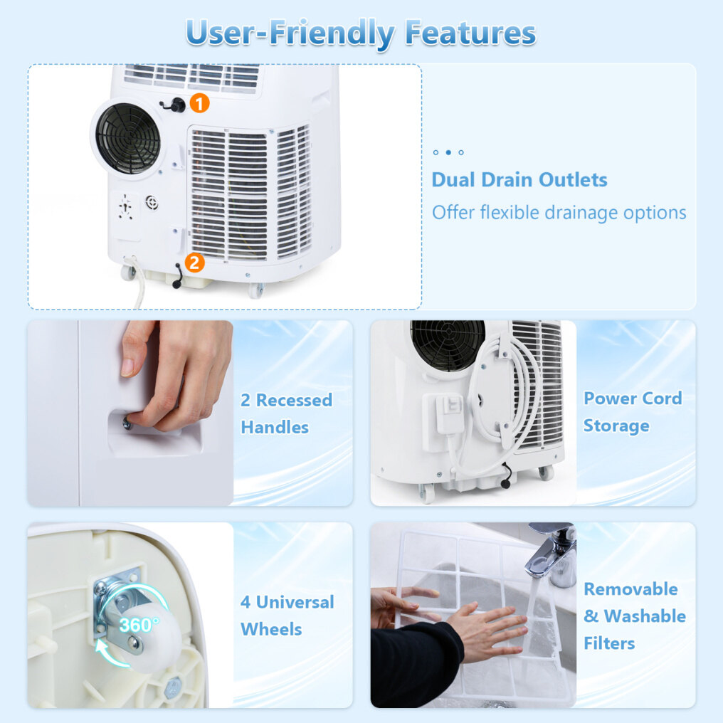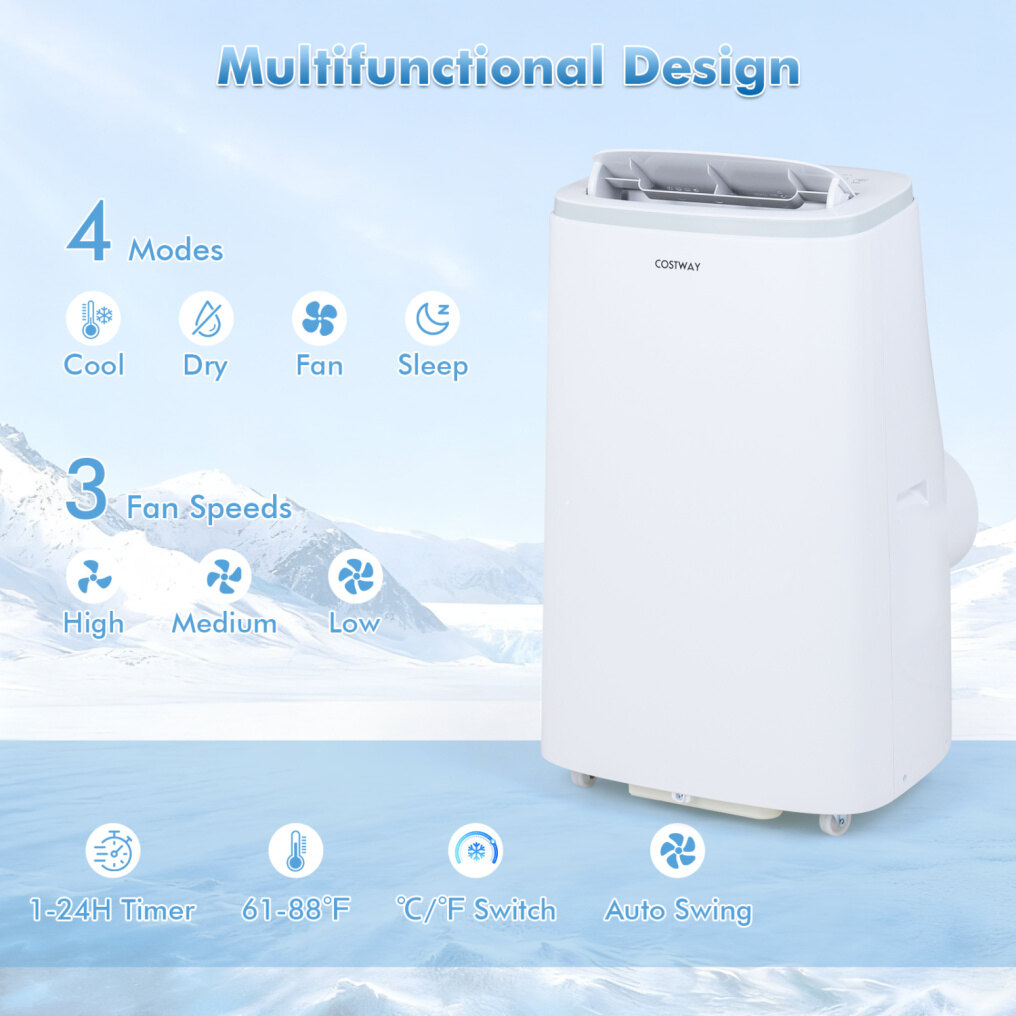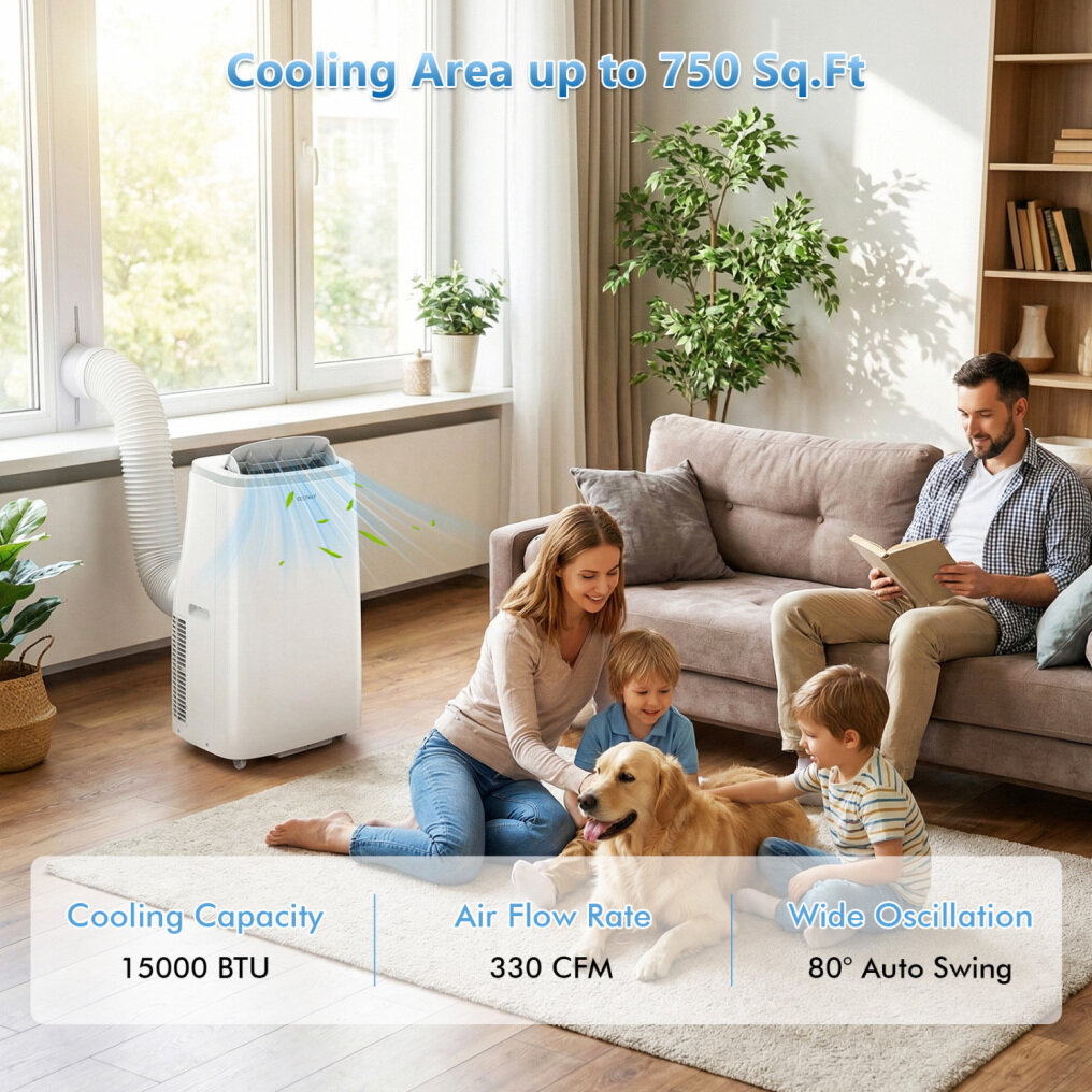 ● 4-in-1 Multifunctional Design: This portable AC unit includes 4 modes (cool, dry, fan, sleep), plus 3 fan speeds and 16-31℃ adjustable temperature range for personalized comfort. The 15000 BTU cooling capacity effectively cools rooms up to 750 sq.ft. 80° auto swing distributes airflow evenly, helping keep large rooms consistently comfortable.