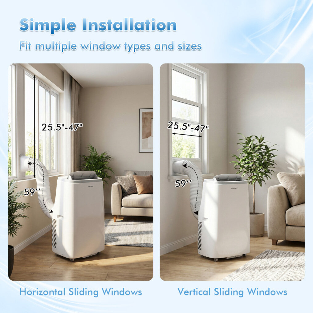 ● Simple Installation for Most Windows: The included window kit can fit multiple window types and sizes, including both horizontal and vertical sliding windows, ensuring a fast and tool-free fit in various spaces. Applicable window width/height: 25.5"-47".