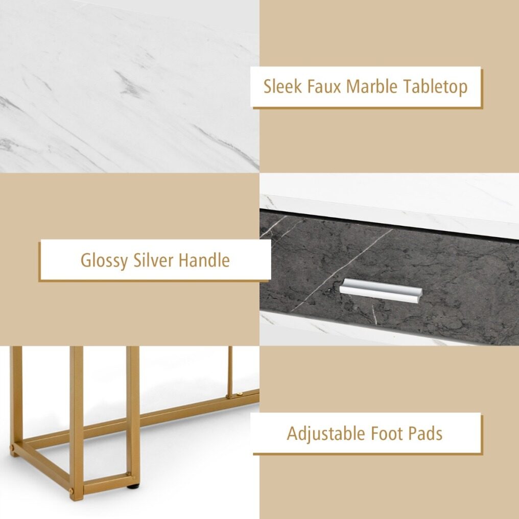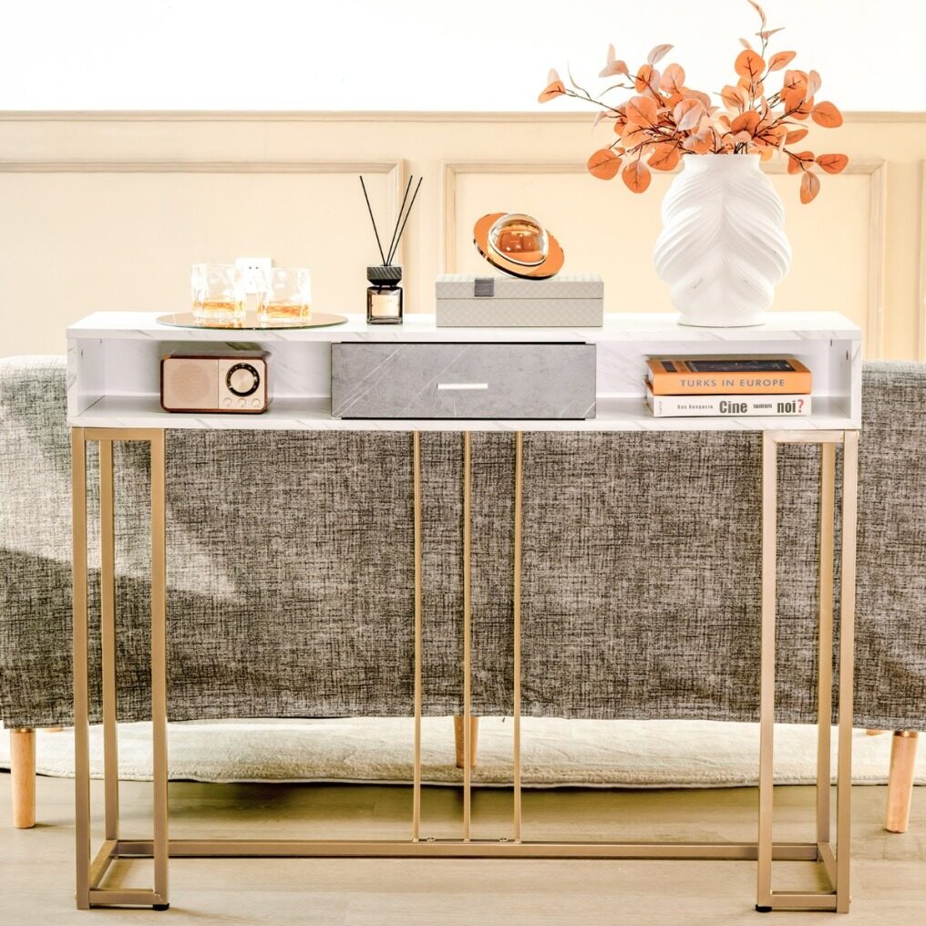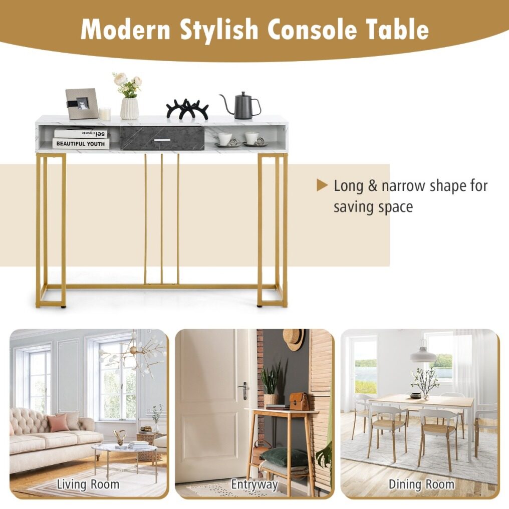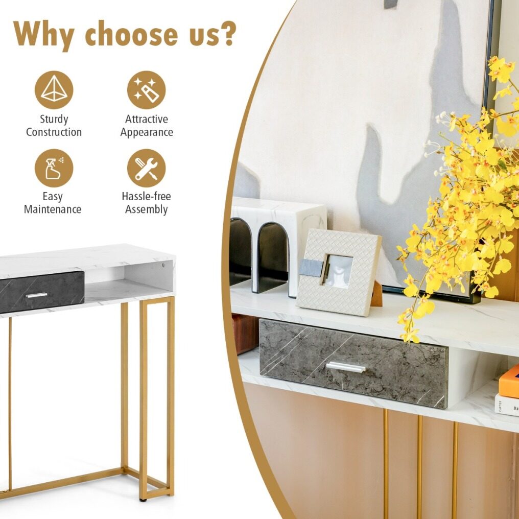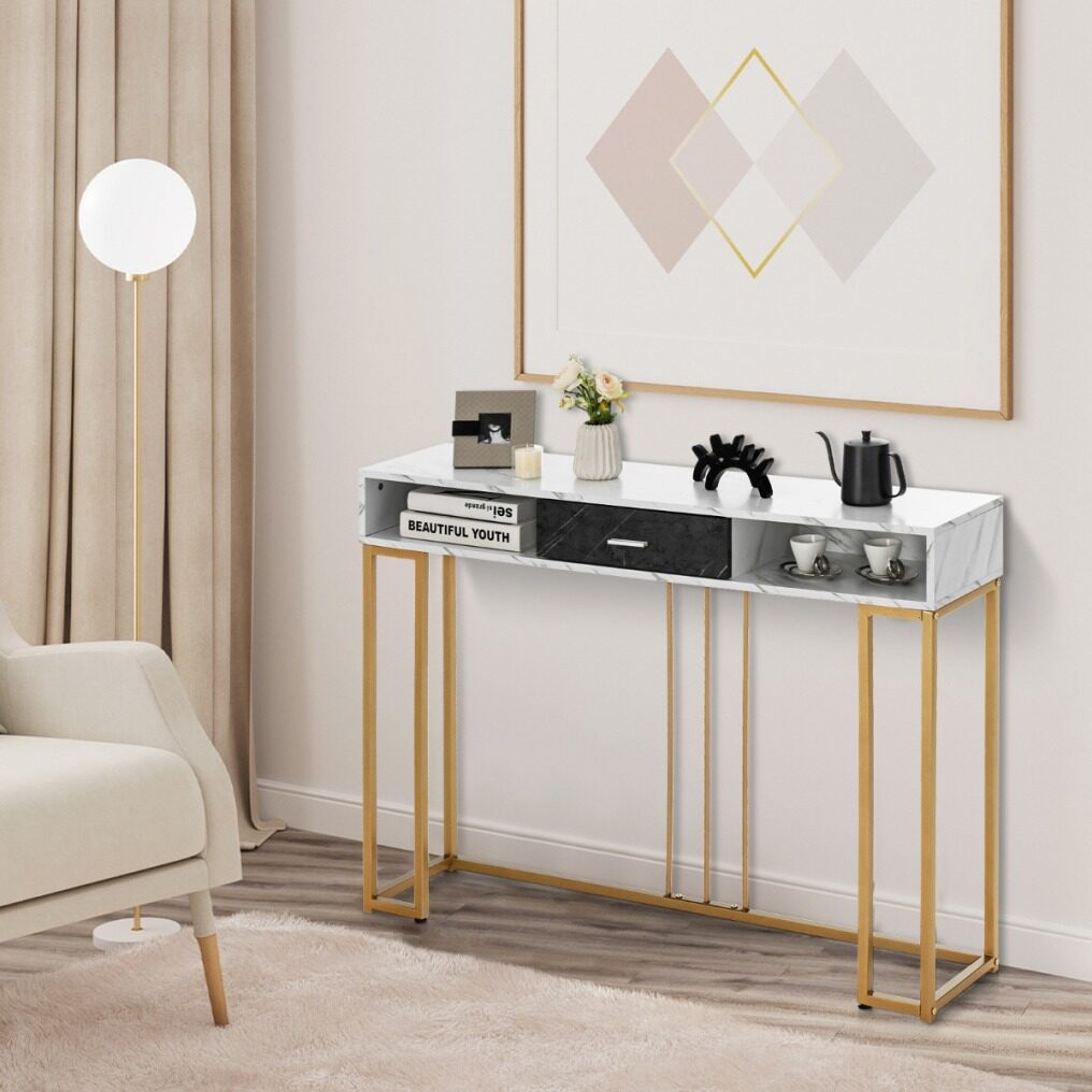 A perfect storage and classification solution for your home! This console table comes with a wide tabletop, a deep drawer and two open compartments to give you enough storage and display space, which brings much convenience to keep a variety of daily items in one place. In addition, the entryway table is designed in a chic faux marble tabletop and gold steel frame to further enhance the aesthetic effect. Thick MDF and powder-coated steel frames have the characteristics of sturdiness and durability, thus promising long service life. More, anti-toppling devices and adjustable foot pads take stability to a higher level. Modern style and elegant appearance make this table a charming complement for the living room and entryway, whether used as a sofa table, entryway table, console table, etc.