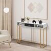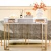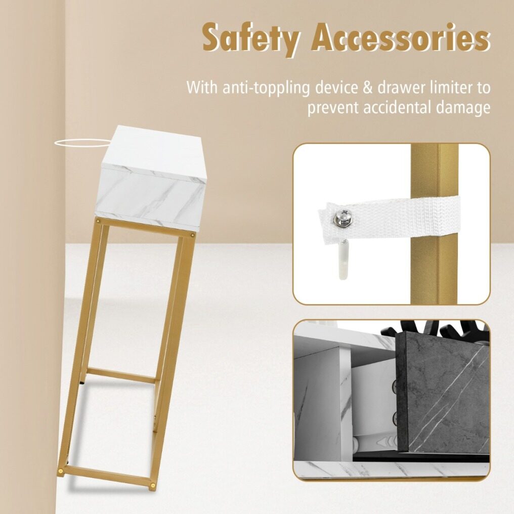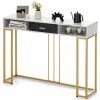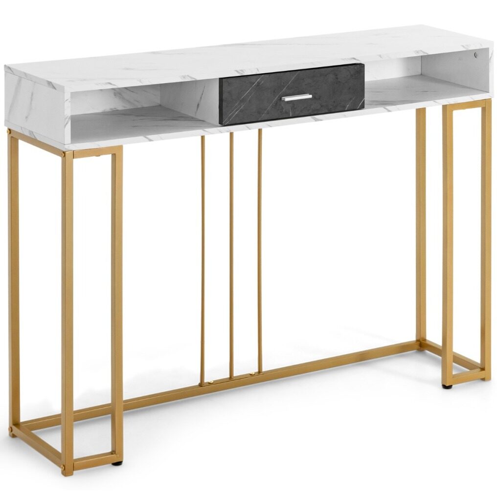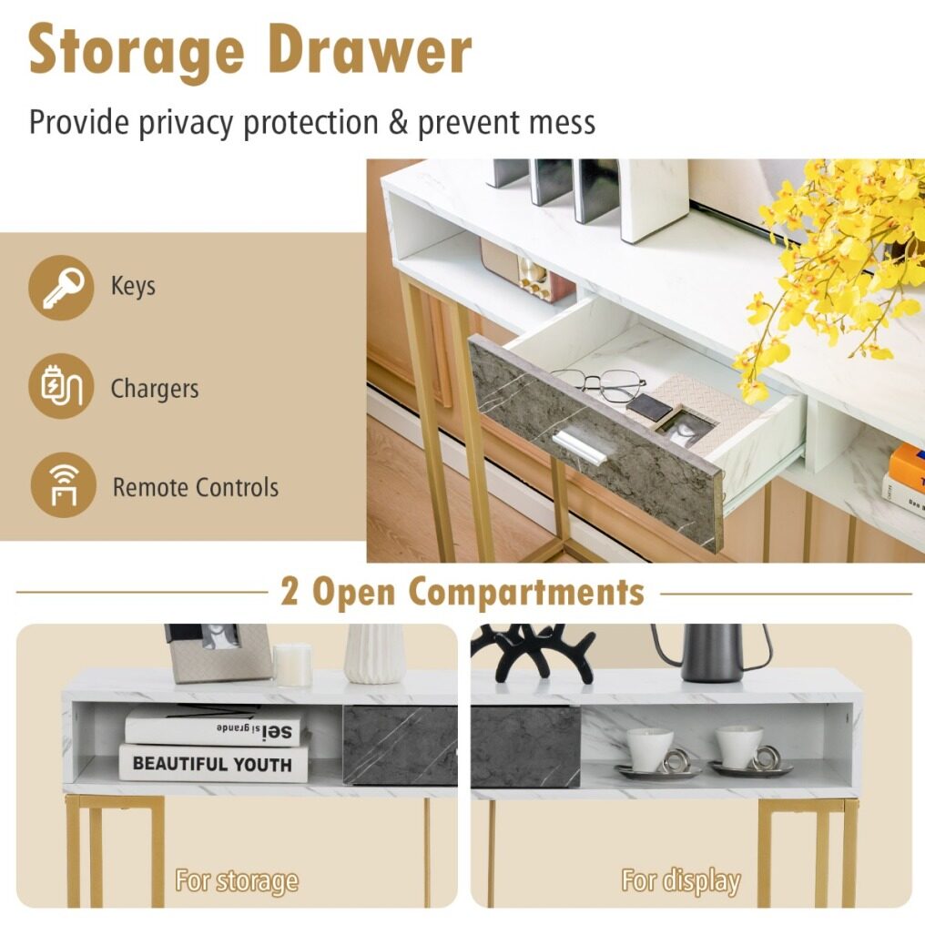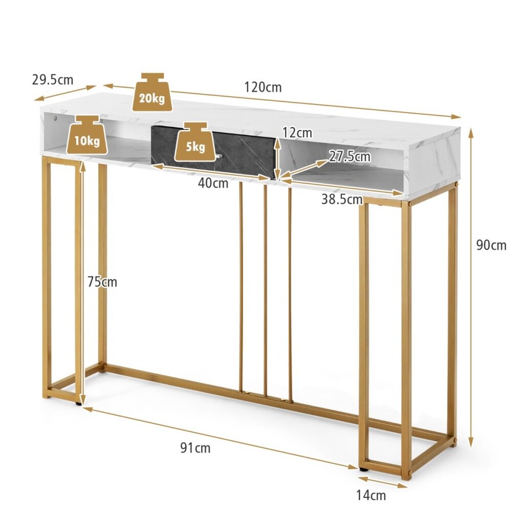 A perfect storage and classification solution for your home! This console table comes with a wide tabletop, a deep drawer and two open compartments to give you enough storage and display space, which brings much convenience to keep a variety of daily items in one place. In addition, the entryway table is designed in a chic faux marble tabletop and gold steel frame to further enhance the aesthetic effect. Thick MDF and powder-coated steel frames have the characteristics of sturdiness and durability, thus promising long service life. More, anti-toppling devices and adjustable foot pads take stability to a higher level. Modern style and elegant appearance make this table a charming complement for the living room and entryway, whether used as a sofa table, entryway table, console table, etc.