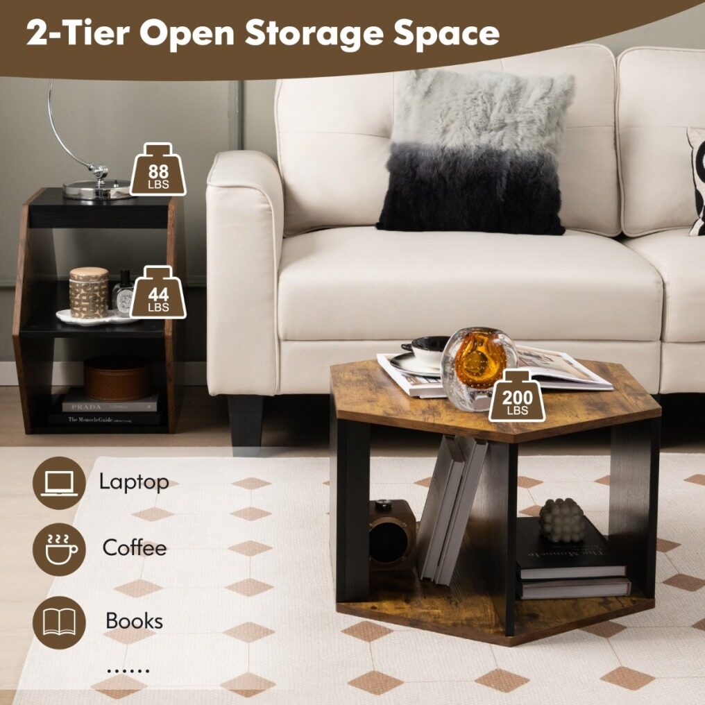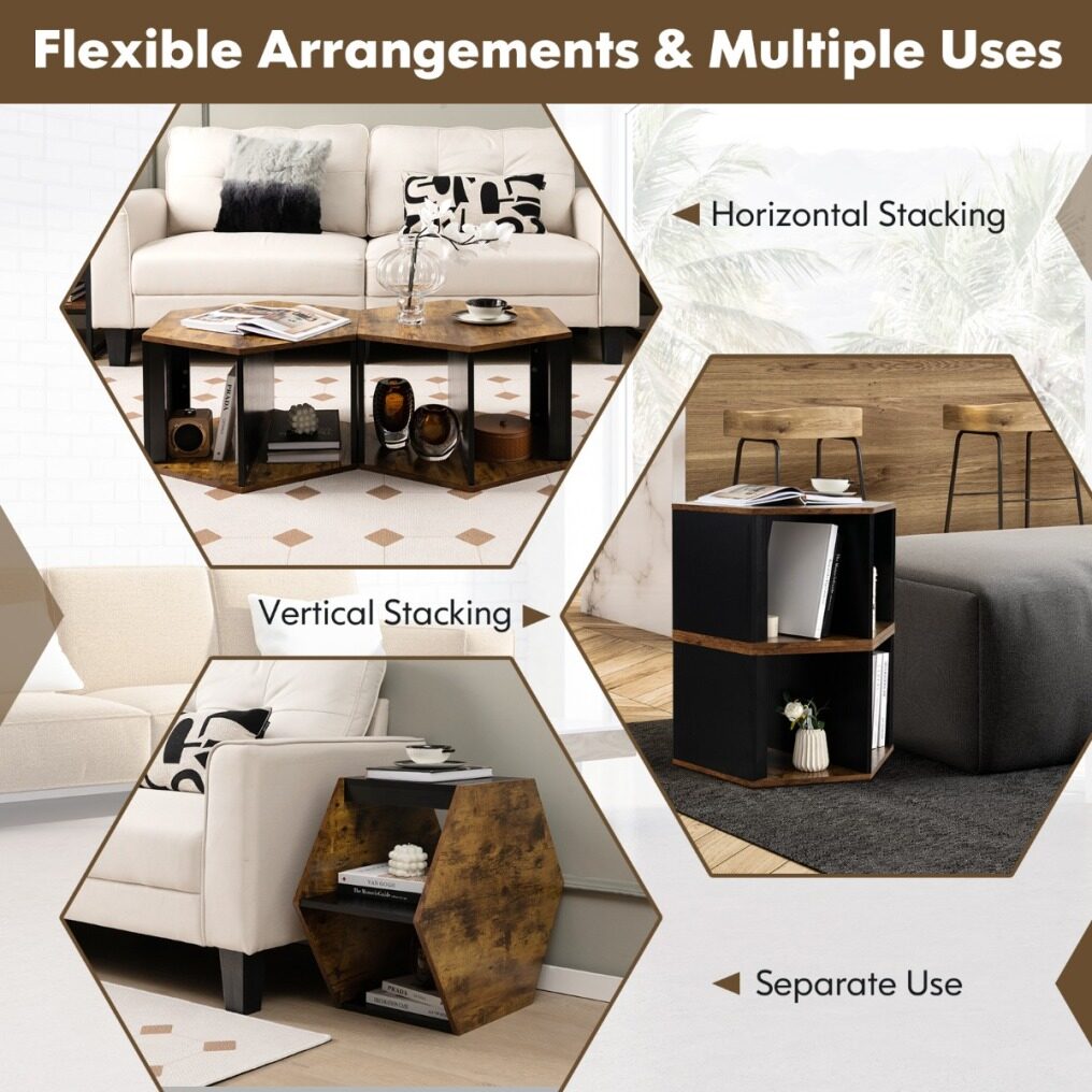 Roomy Storage Space: The middle storage shelf divides each hexagonal side table into 2 open storage parts for objects that are nor needed frequently. Likewise, the spacious tabletop will accommodate a cup of coffee, a laptop and some other items, allowing you to have access to them once you need.