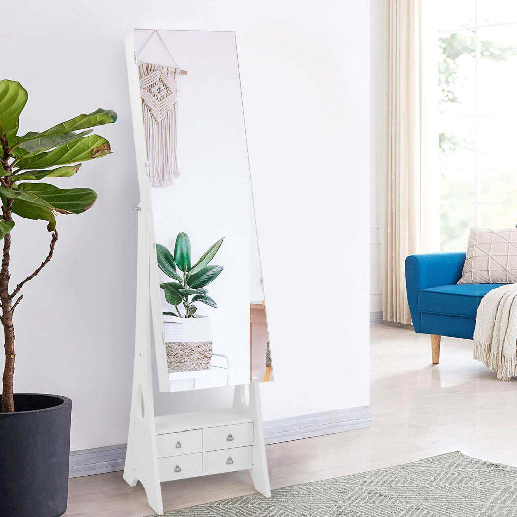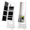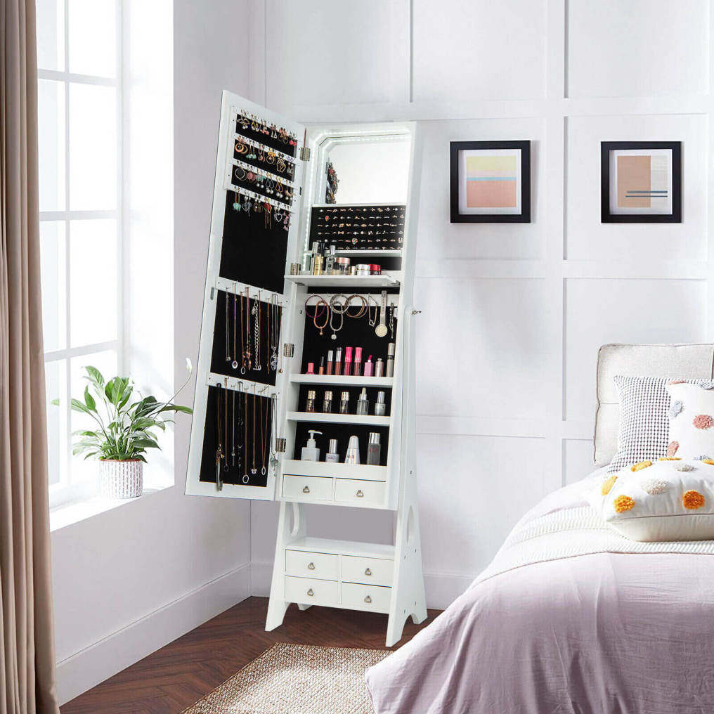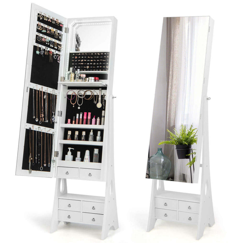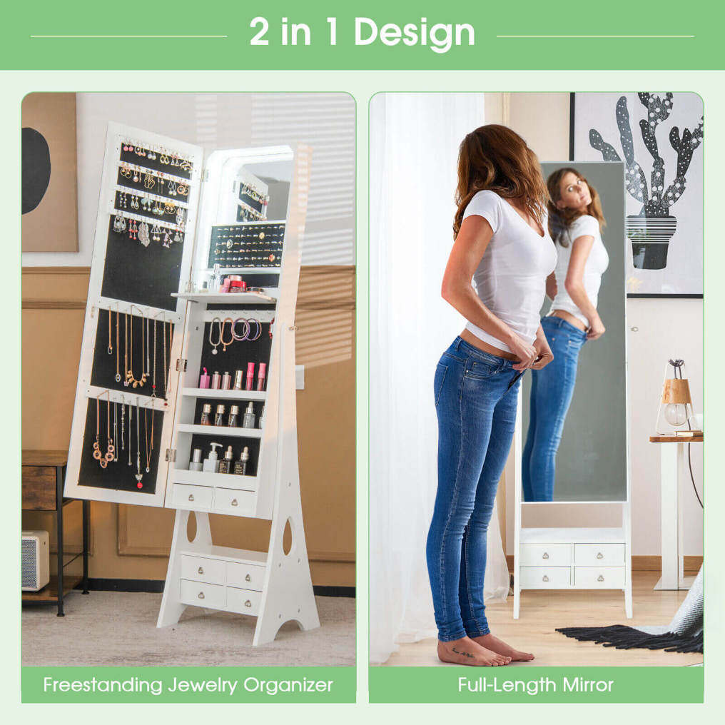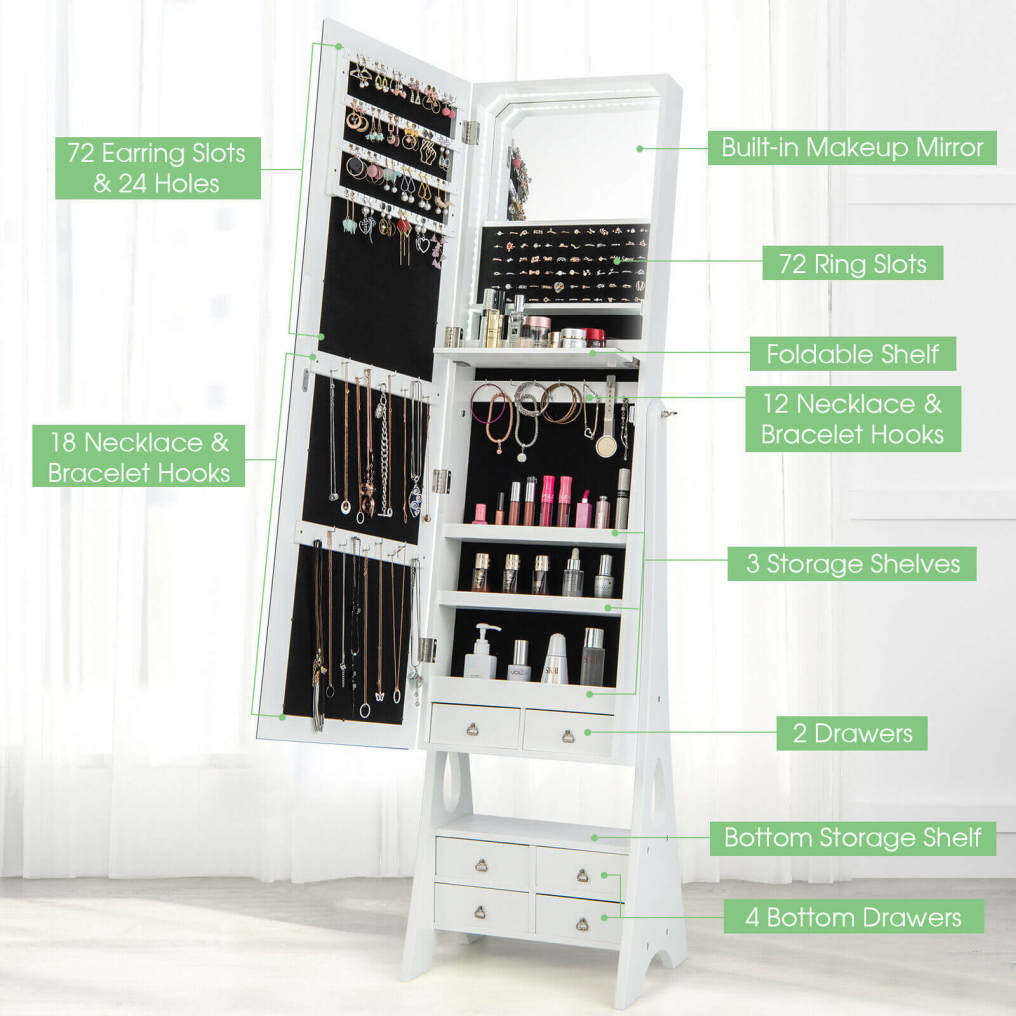 ● 3-in-1 Jewelry Armoire: This multifunctional storage cabinet combines a jewelry organizer, full-length dressing mirror and makeup center in one, which effectively increases your space efficiency. The inside mirror can be used to make up or try on jewelry while the full-length mirror allows you to check out the whole outfits.