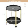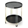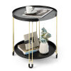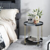 Add the side table to your home as a storage helper and a decoration! 2-tier frame, made of reinforced metal, features excellent sturdiness to hold various items, such as snacks, books, decorations, etc. Especially its top shelf has a 3.5cm high edge to keep items in place and an 20cm wide gap for easy access. More, it is feasible to directly remove the bottom shelf and use it as a separate food tray. Since the 45 x 45 x 50cm (L x W x H) accent end table is fitted with round protective pads, it is safe for multi-scene uses without scratching the floor. When the dolomite panel meets the gold metal frame, a modern style is highlighted.