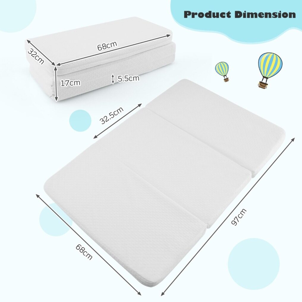 Quality-built using premium memory foam for maximum toddler sleep/play comfort and a firmer sponge side for the support newborns require the tri-fold mattress provides babies with a sweet sleeping experience. Each mattress pad is sized to ensure a snug and secure fit within all standard playards measuring 97 cm x 68 cm. This foldable baby mattress can not only be used while the child is sleeping or napping, but also can be used as a playard at daycare, and hotels! The removable fabric cover is water and stain resistant and can be machine-washed. Our portable tri-folding mattress with a carry bag also makes it a good choice for outdoor use in parks or while camping.