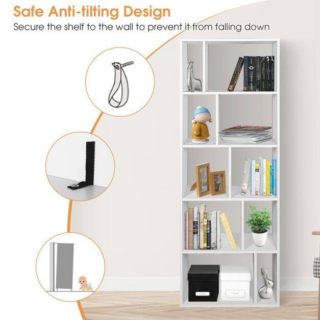● Compartmentalized Design and Large Storage Space: This functional storage shelf has a five-level structure and 10 storage compartments of different sizes. It not only provides you with plenty of storage space, but also allows you to sort your items for easy access. It can accommodate your daily necessities, including decorations, books, magazines, potted plants, photo frames.