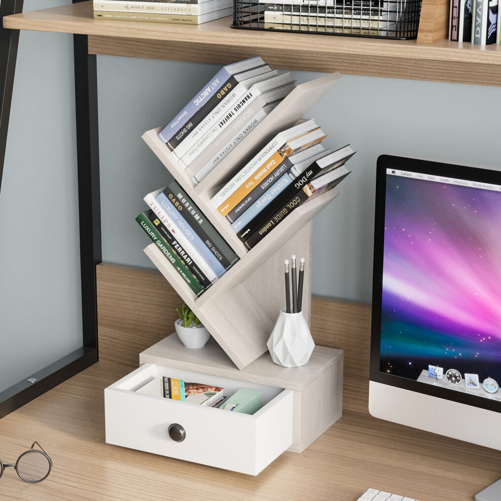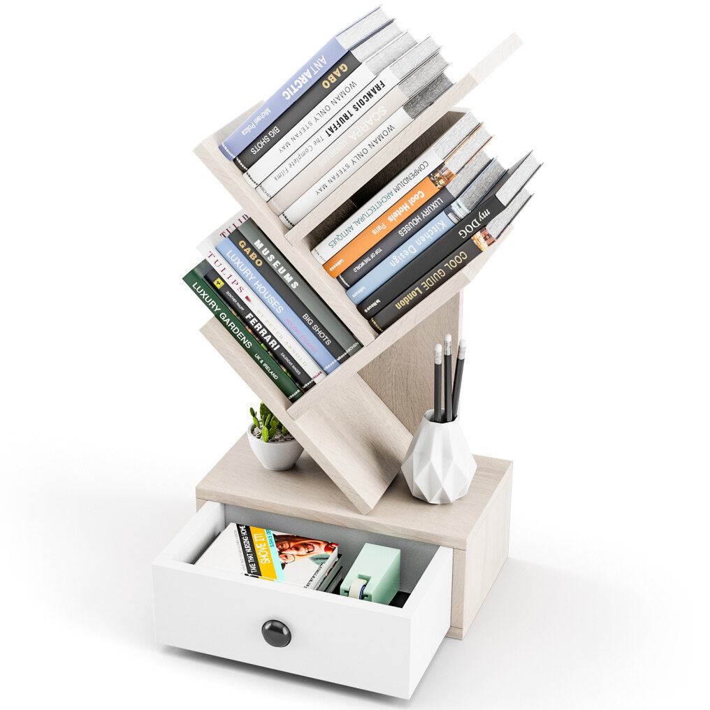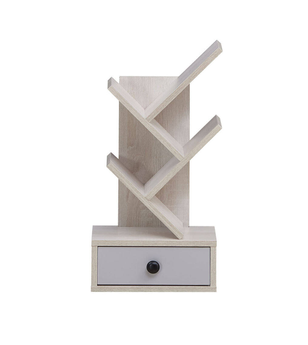 ● Large Storage for Daily Use: The tree bookcase features 5 shelves in total, enabling you to fully utilize them for CDs, 5-10 books, magazines and decorations. Besides, there is also a 9" x 5" x 3" (L x W x H) drawer at the bottom, designed for private storage. Thus, it's an ideal place to accommodate your keys and wallets.