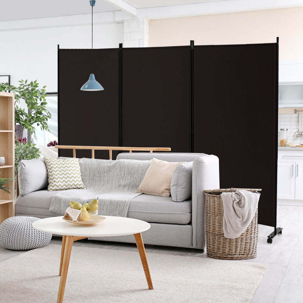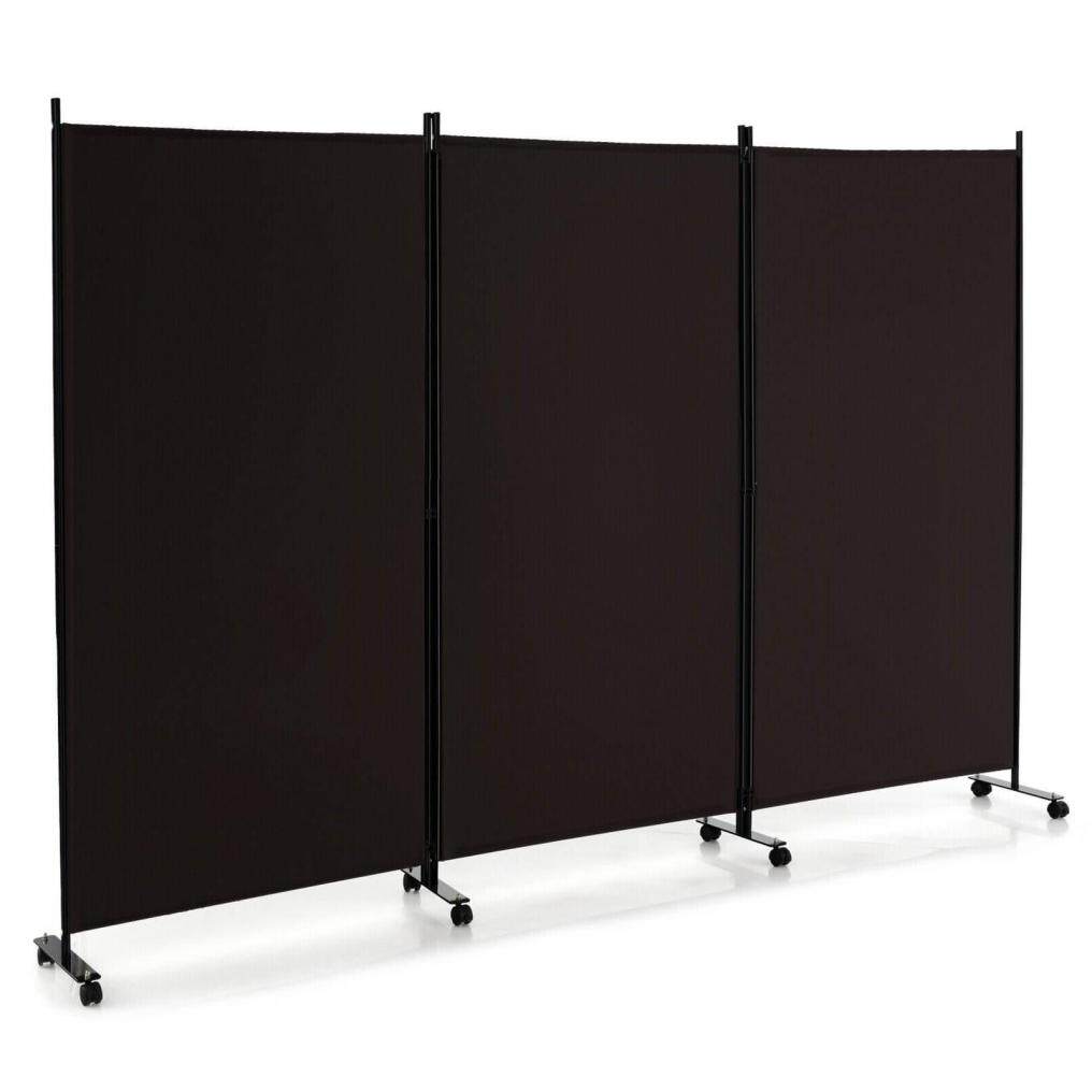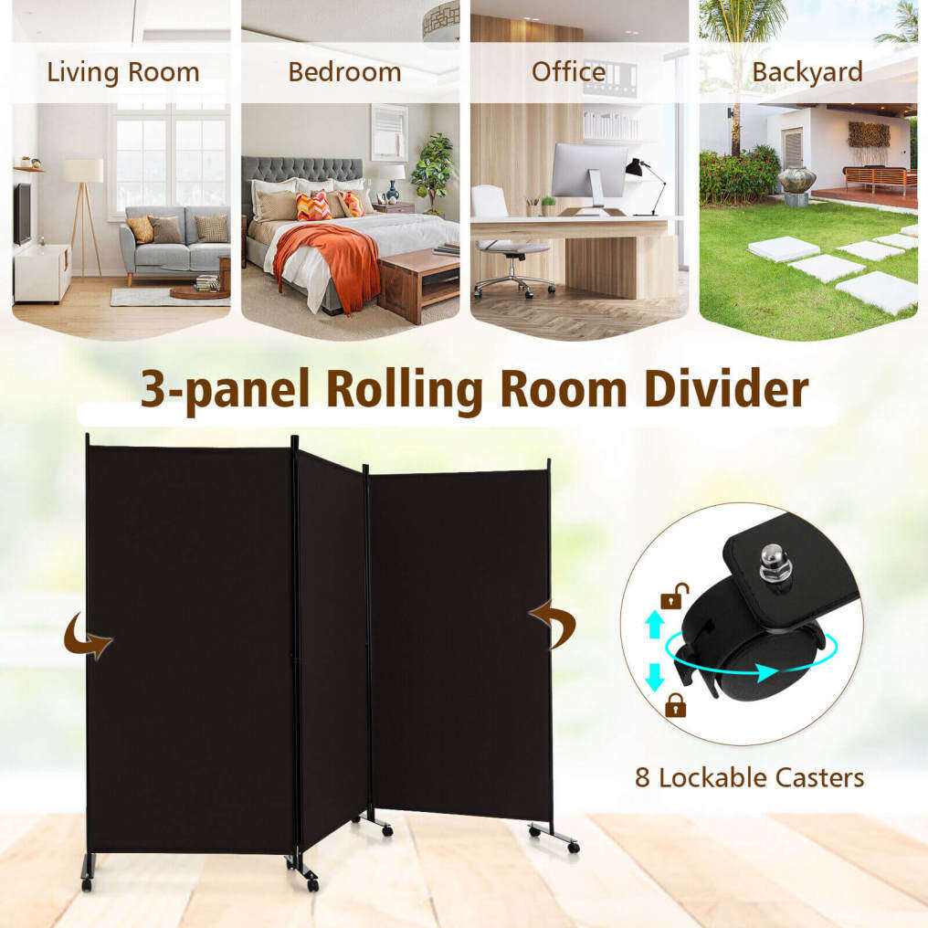 3 Panel Folding Room Divider with Lockable Wheels-Brown