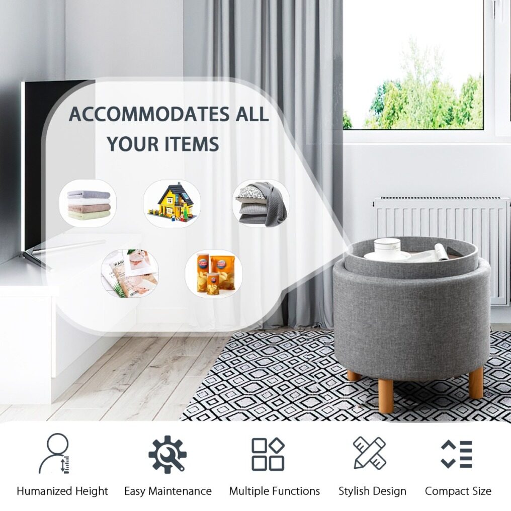 - Storage Ottoman with Removable Tray Top: The round footstool is equipped with a removable tray top, which allows you to treat this stool to a side sofa table. Flipping over the lid, you can put some desserts and cups to enjoy tea time. Since its wooden layer, this tray ensures high load capacity and easy maintenance.