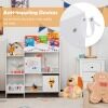 Our storage display cabinet will be a great addition to your kids’ room. This cabinet is designed with a kid-friendly height for kids to reach and thus allows kids to learn to organize by themselves after playing and reading. Featuring 5 compartments, 2 cloth drawers and 3 slots, the storage cabinet provides ample space for displaying books and storing toys, snacks and more. Considering safety, you can fix the cabinet to the wall by including anti-toppling devices. In addition, the rounded edges and non-slip foot pads add additional safety and stability while using. The assembly is easy with instructions.