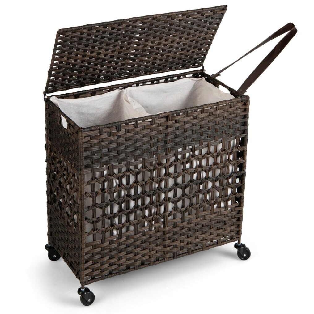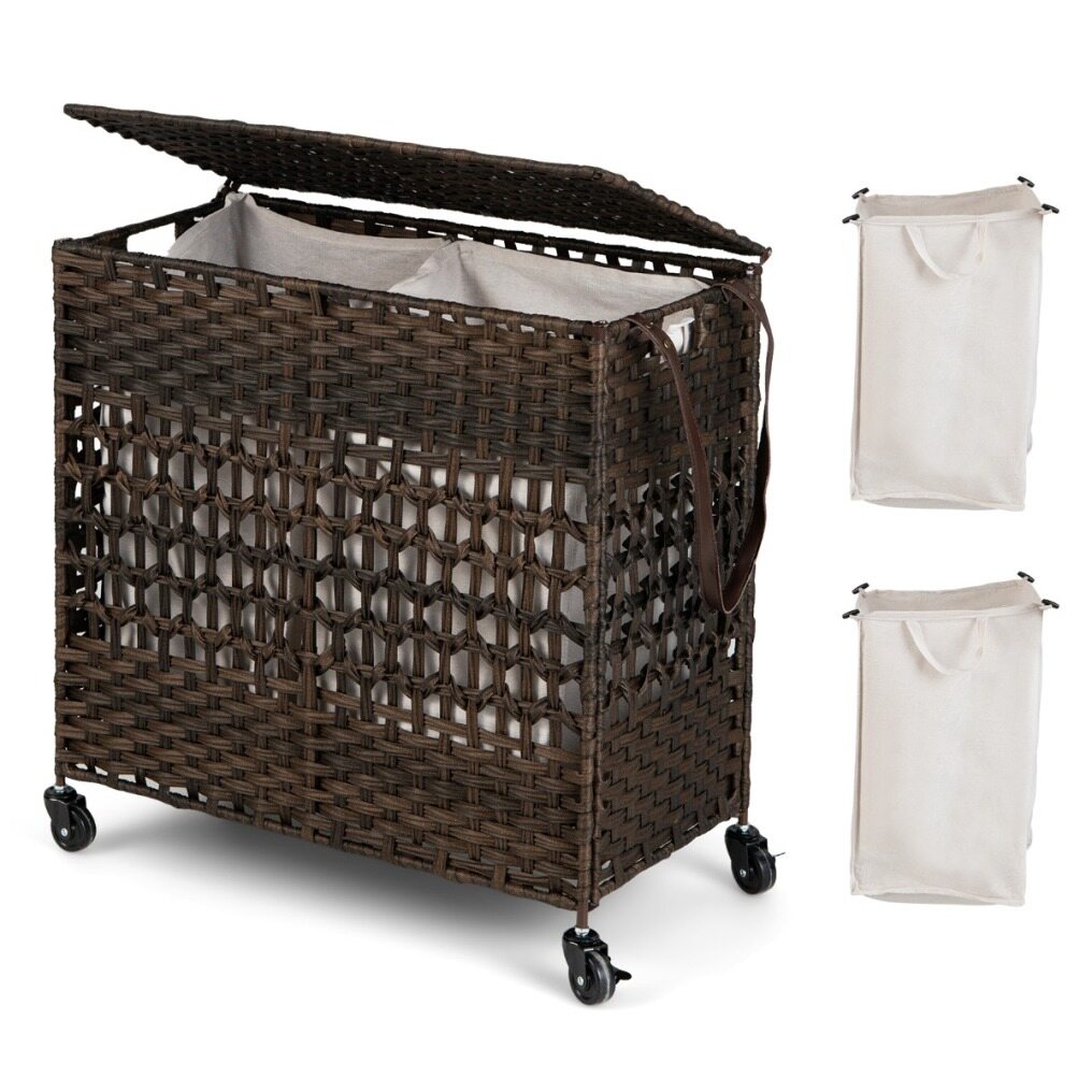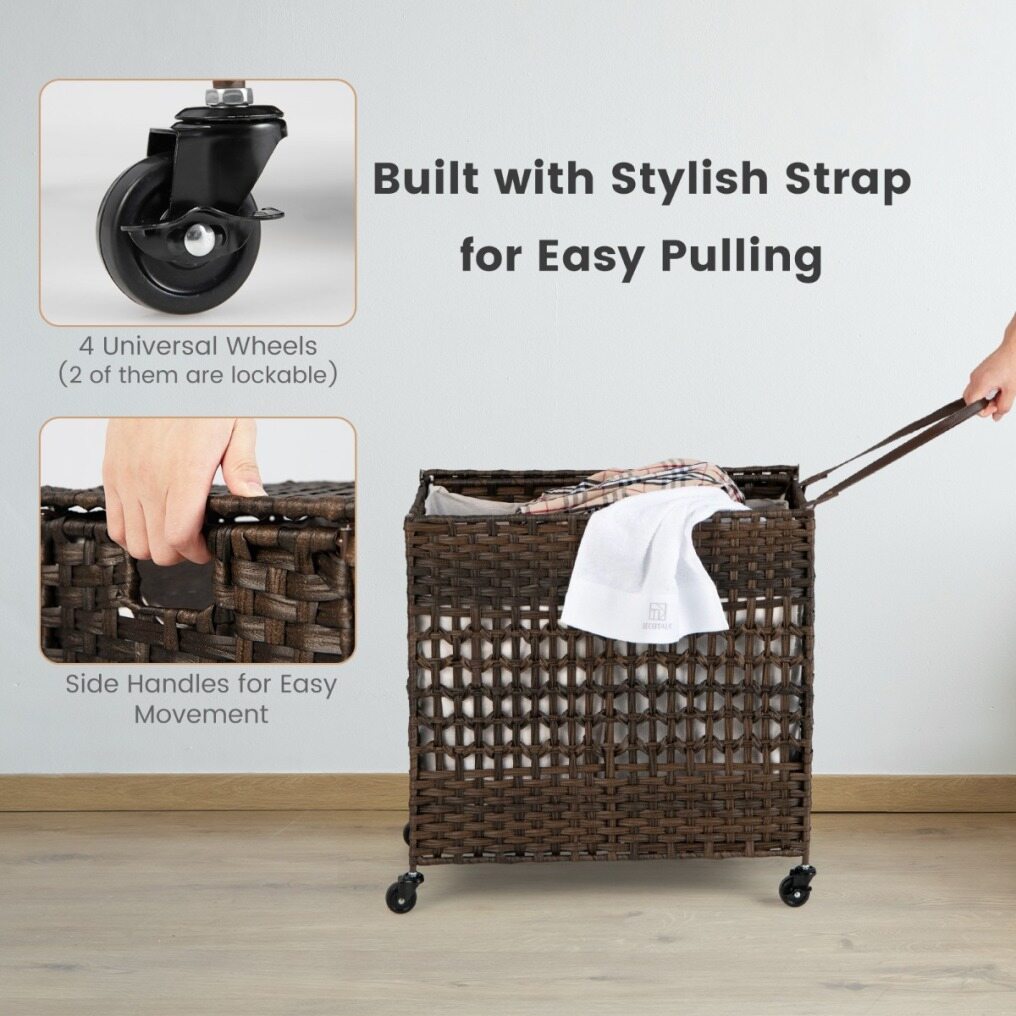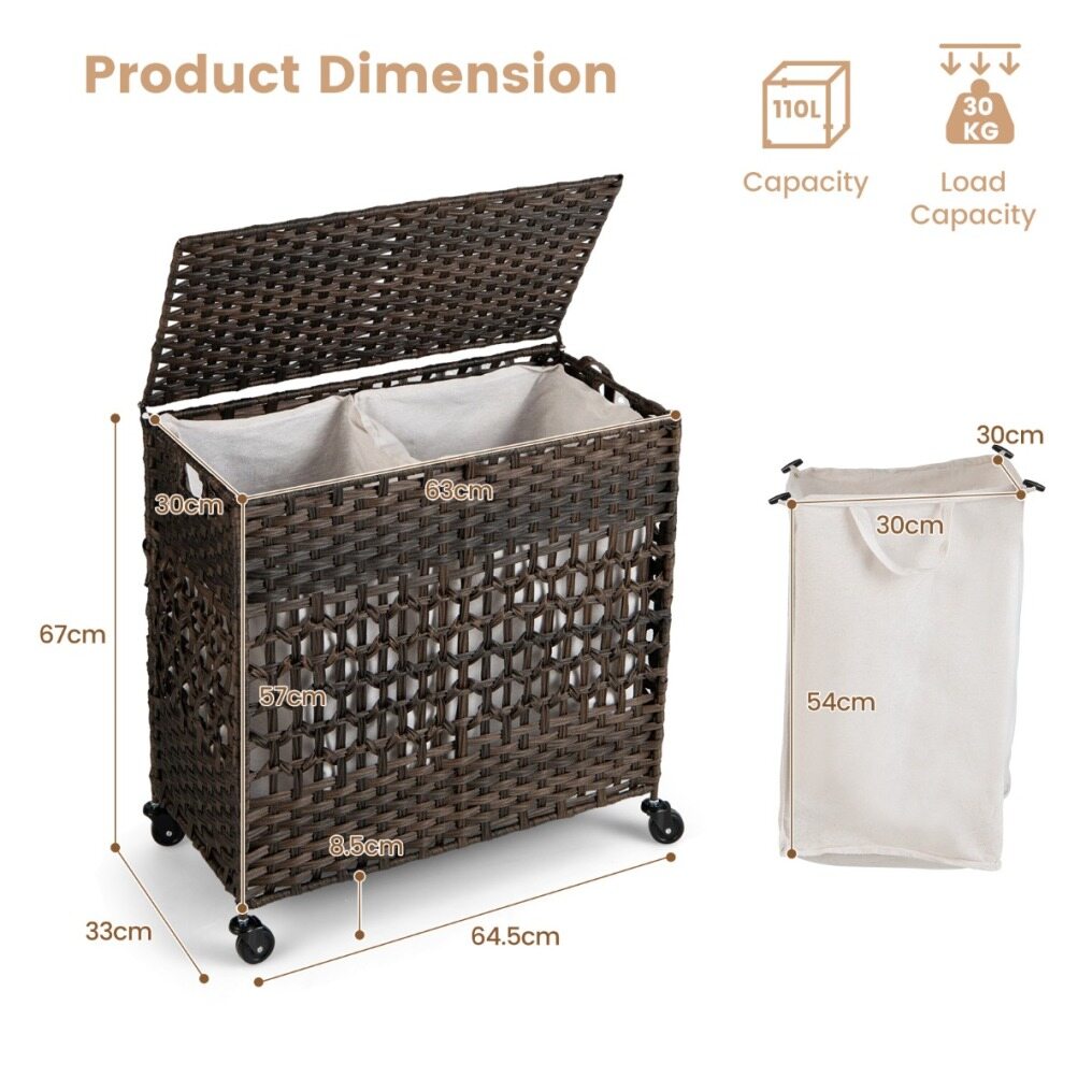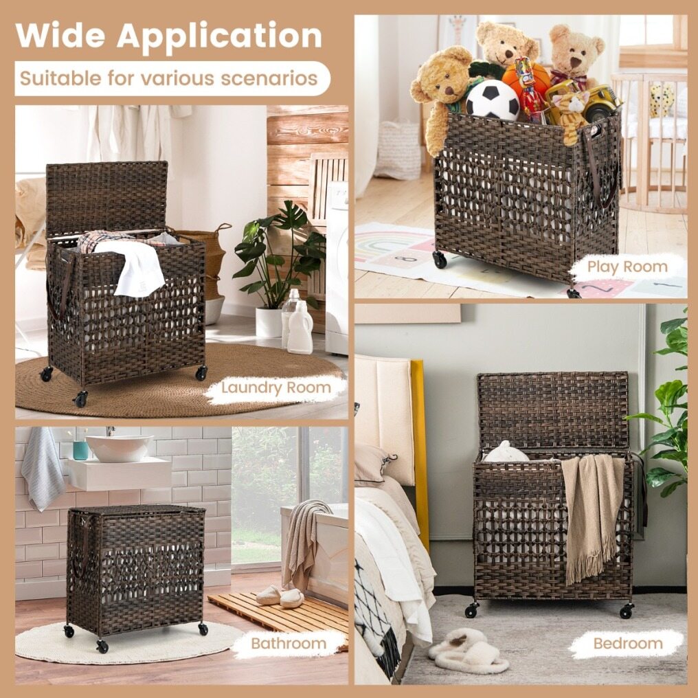 Have you ever been troubled by the unreasonable structure and size design of the laundry hamper? Our clothes basket would be worth considering. With the large storage capacity of 110L, you will no longer be bothered about the messy room. More, 2 removable and machine washable liner bags are made of soft polycotton fabric and fixed with buckles, which enables you to sort clothes of different colours and materials. The combination of waterproof PE rattan and solid steel frame ensures a rugged and durable structure. Considering convenient use, the laundry hamper comes with recessed handles and a PU strap for easy transportation. In addition, there are 4 smooth rolling wheels (2 of them are lockable) at the bottom for free movement. All in all, this synthetic rattan clothes hamper is a perfect piece for the laundry room, bathroom, and bedroom. When not in use, it can be folded into a compact size for easy storage.