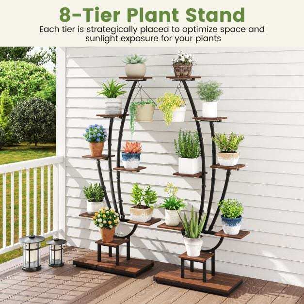 ● Spacious Displaying Space: The 8-tier plant stand includes 1 large shelf, 7 small shelves, and 1 hanging hook, effectively utilizing the vertical space. Each tier is strategically placed to optimize space and sunlight exposure for your plants, promoting healthy plant growth.