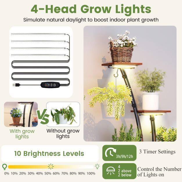 ● 4-Head Grow Lights: The indoor plant stand is equipped with adjustable grow lights, which offers 10 brightness levels and 3 auto on/off timer settings (3/9/12 h), ensuring the optimal lighting condition for plant growth at various stages. Plus, tailor the light use with options to activate all 4, just 2 above, or 2 below lights.