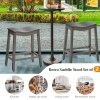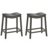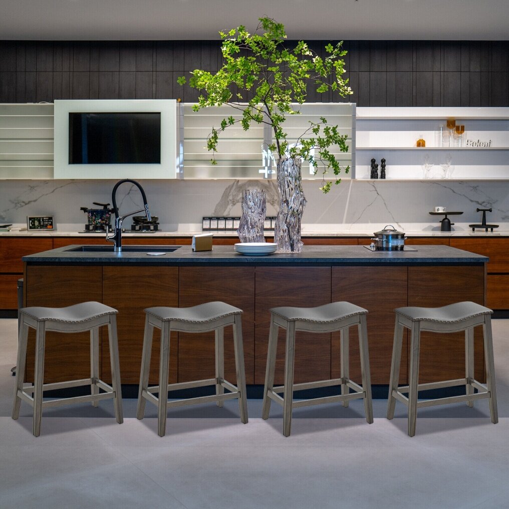 These saddle stools are great vanity stools or dining seats in your kitchen, make-up room, living room and recreation room. With solid rubber wood legs and a footrest to rest your feet, these stools are sturdy and comfortable. And the non-slip foot pads add more stability while protecting your floor. The comfortably padded cushion with a slightly curved design can fit your hip well and prompts ergonomic seating. The high-endurance PVC leather with beautiful nailhead trimming elevates the taste and delivers up-scale furniture to your rooms.
