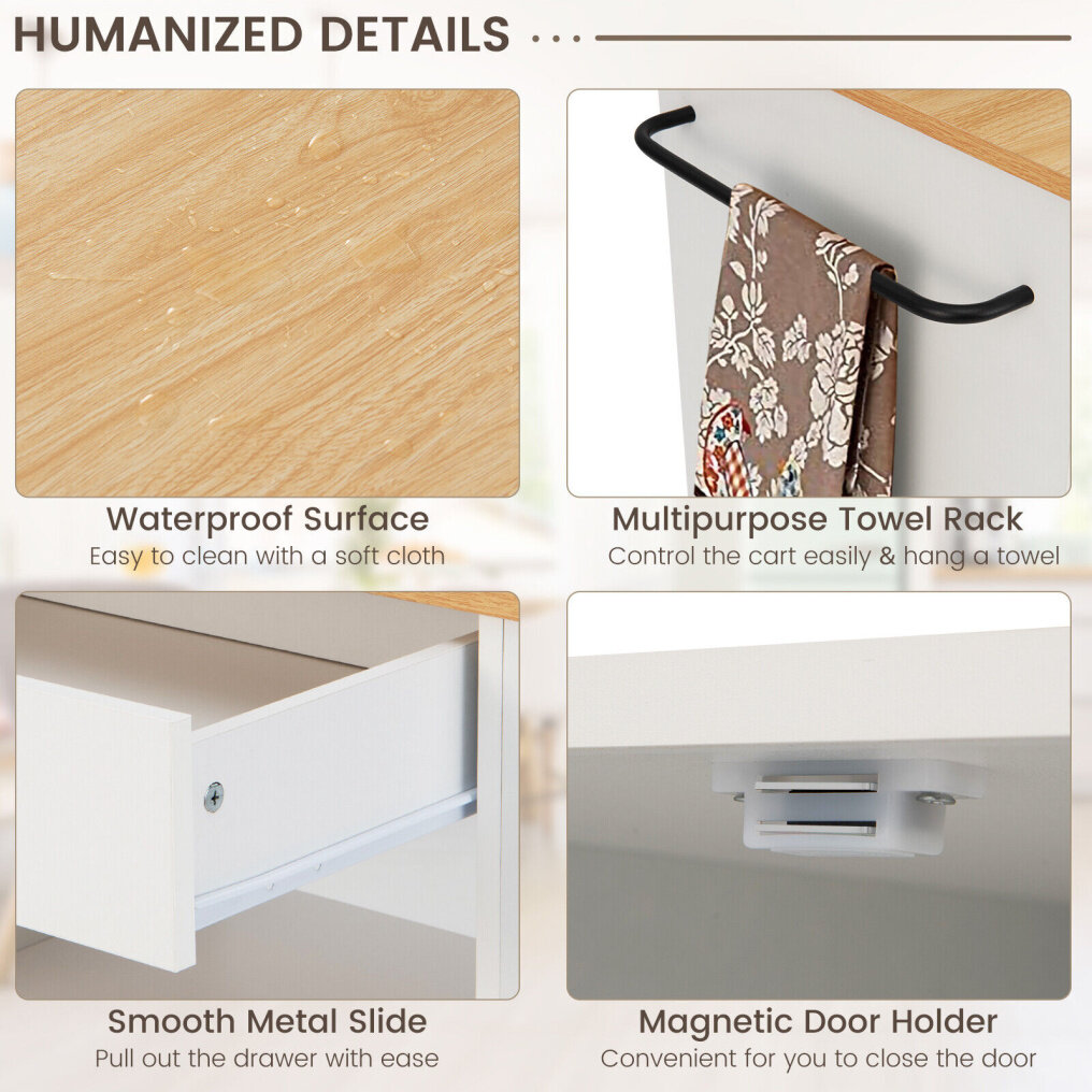 ● Multiple Storage Options: This kitchen island cart is a great helper to keep your kitchen well-organized. In addition to placing the prepared food and kitchen utensils on the spacious countertop, you can store, dinnerware, small appliances, bottles and wines in the drawer, open shelf and the large cabinet.